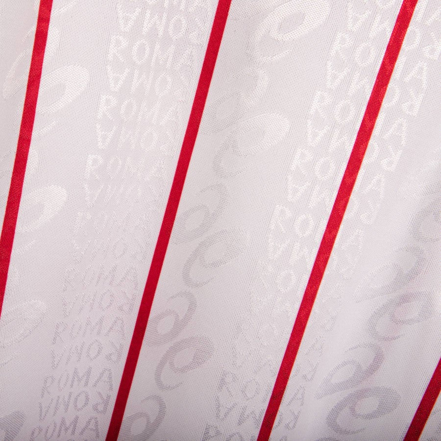 Short-sleeved model in white with yellow-red inserts. The shirt is characterized by the presence of the Asics logo and Roma lettering in the weave. The top, shoulders and sleeves are red, while the knit collar and V-neck are red with orange inserts. Seven red stripes fall vertically ending on the bottom hem of the shirt. On the front, on the heart side, the AS Roma crest is sewn, on the right the logo of the technical sponsor Asics is embroidered, while in the centre, in sublimation, the commercial sponsor Ina Assitalia.