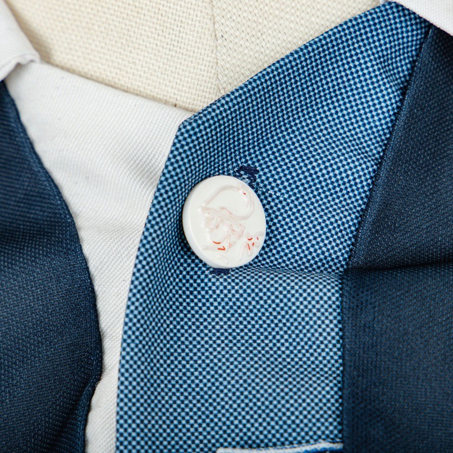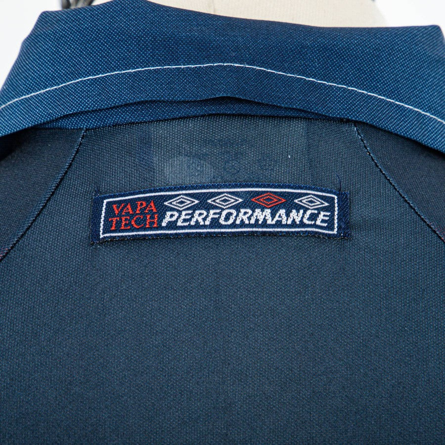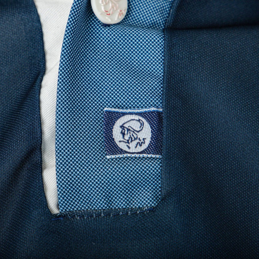 The product is clearly visible from the various photos. The shirt has short sleeves, has a white stand-up collar that closes with two buttons and its main color is black, with the presence of white and red on the sleeves; in the center we find, from right to left, the white wording with red border of UMBRO, technical sponsor, the club logo and, finally, in a vertical direction, the name of the commercial sponsor, ABN-AMRO, in white; within the plot, the logo of the Amsterdam team is repeated five times, in significantly increased dimensions and in blue.