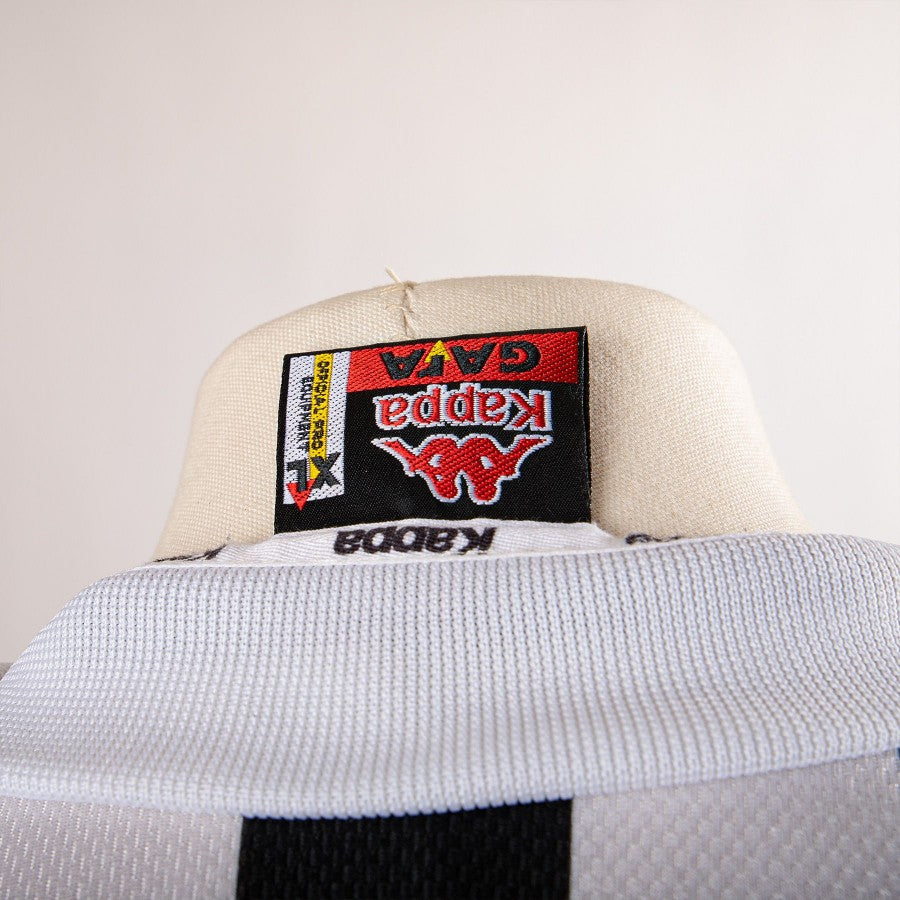 Juventus first jersey for the intercontinental cup of 1996. model with polo neck and long sleeves. Black and white color. On the front are embroidered the two stars on the heart side, while the team logo is applied with sublimation print in the center of the V-neck. Technical sponsor Kappa embroidered on the right side. On the back are printed black lettering DEL PIERO, while the number 10 is applied with sublimatic printing. Along the left sleeve there is the writing European /South American cup 1996.