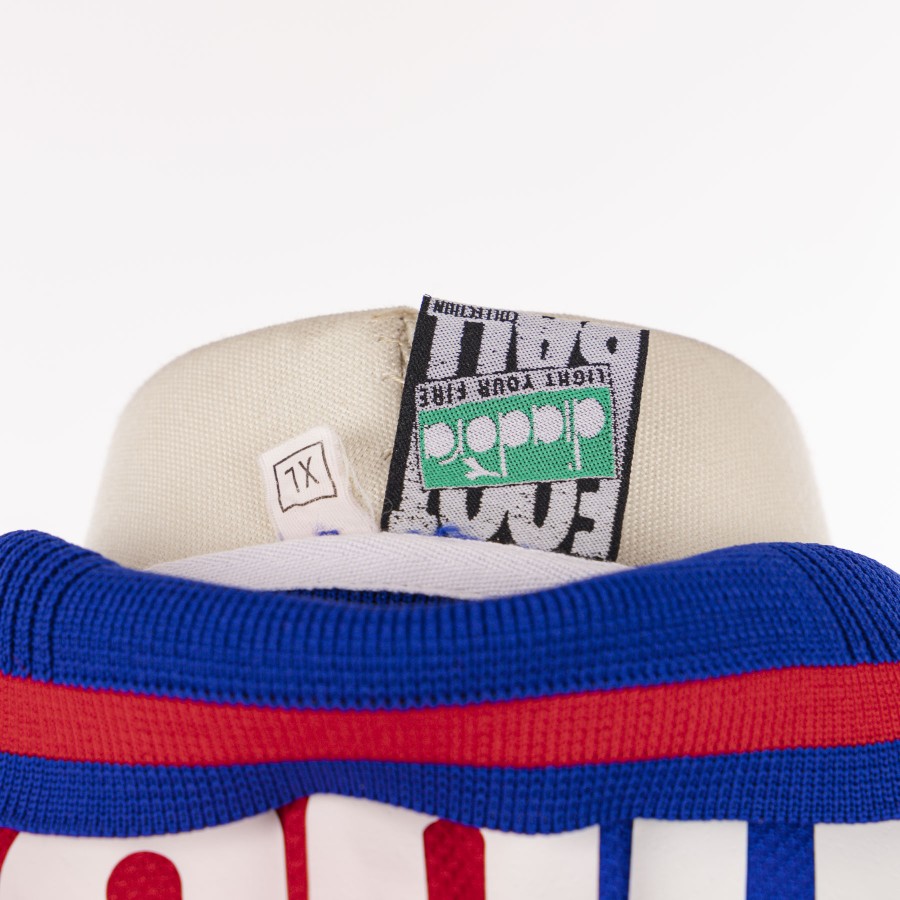 The Bologna jersey in the 1997/1998 season features the typical colors of the Emilian team: with red and blue vertical stripes. The edges of the sleeves and the jersey collar are characterized in the same way, as well as the neckline of the tunic. The emblem of the Bolognese club is sewn on the heart side, while the lettering of the technical sponsor Diadora is legible on the right, while that of the commercial sponsor Granarolo is visible in the centre. The Lega Calcio di Serie A patch is sewn onto the right arm. On the back you can see the customization with the number 17 Foschini, with a print that is not exactly perfect, but which still makes the writing identifiable.