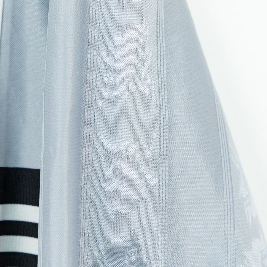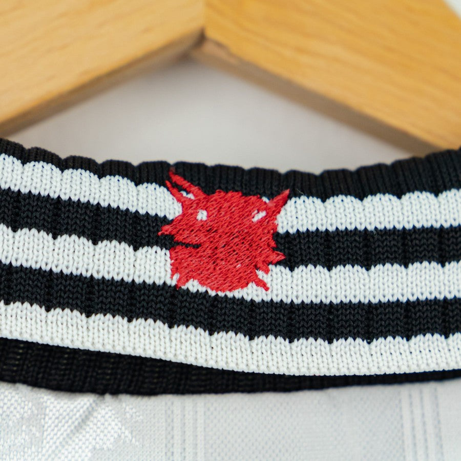 Model with white and gray stand-up collar with black inserts. In the center we find the Adidas lettering with the team crest.