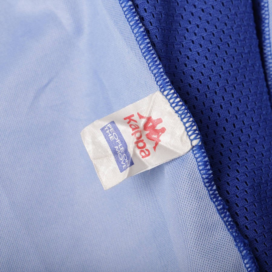 Away version of the Juventus jersey, football season 1997/1998. Short-sleeved model with polo neckline. Colour royal blue with yellow inserts. On the front of the jersey is embroidered the logo of technical sponsor Kappa and commercial sponsor Sony applied with sublimation printing. The team patch is embroidered on the left sleeve.