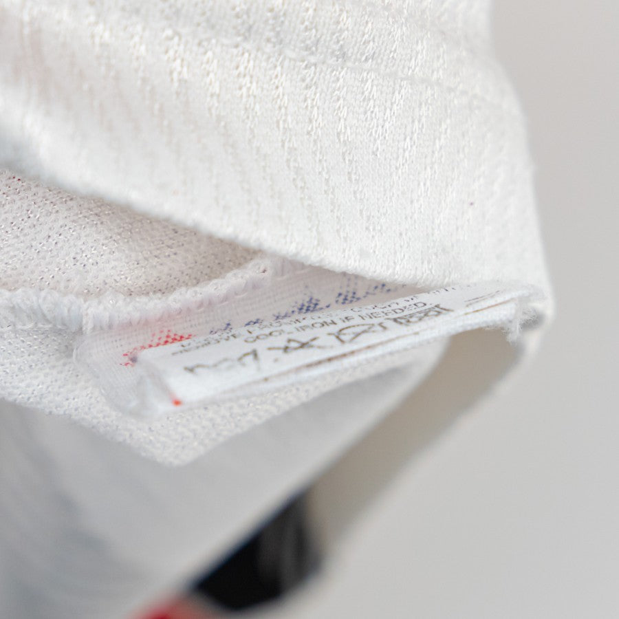 The Away Match Shirt is made by Lotto in white with black and red details on the sleeves and sides of the shirt, the colors are as bright as originally. On the front of the shirt it is