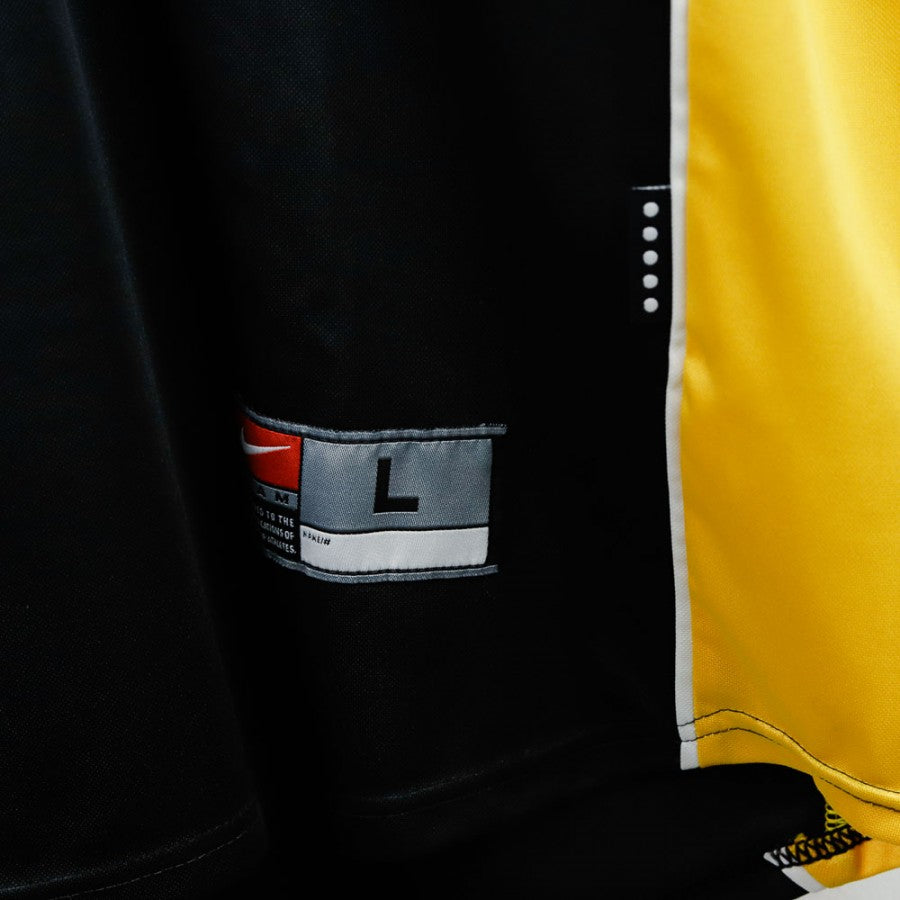 1998/1999 Away Borussia Dortmund Shirt made by Nike. This away jersey features the iconic yellow and black colors of BVB with white details, and displays the Nike technical sponsor and main sponsor s.Oliver on the chest. The word “Dortmund” is featured on the lower back, a unique touch from the era. Size L is shown on the inner label.