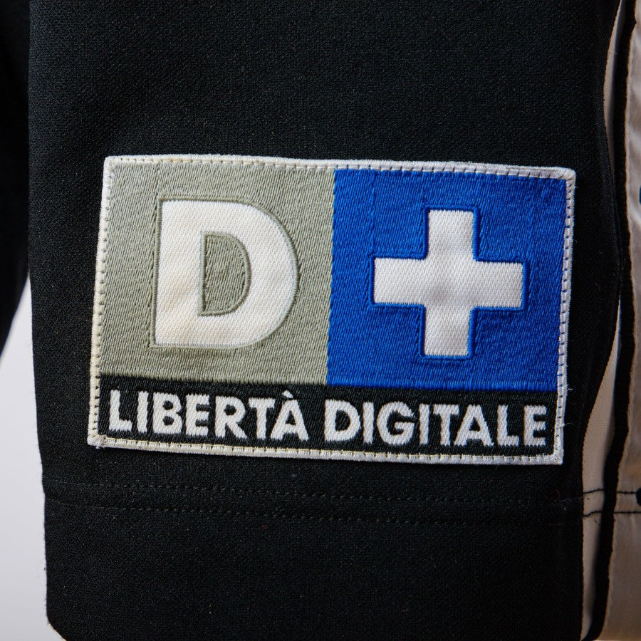 On the front left side sewn patch technical sponsor D+ Digital Freedom.