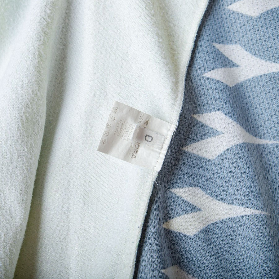 Away model of the Udinese shirt produced by Diadora for the 1999/2000 football season. Long-sleeved version with polo collar and in yellow colour with black details. Complete with JORGIGNHO 14 personalization and Lega Calcio patch. Udinese Calcio patch embroidered on the heart side and Diadora technical sponsor applied in flock. Main sponsor Telit. Also sewn on is the Diadora authenticity label.