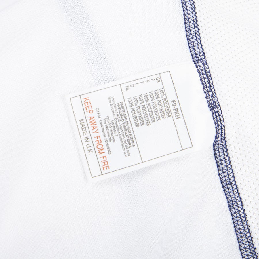 Model away short sleeve white, knit collar, V-neckline woven in dark blue that echoes the edge of the sleeves. Elegant blue stripes fall vertically from the shoulders both front and back. Napoli patch stitched heart side, while Nike technical sponsor in light blue is embroidered on the right. In the center commercial sponsor Peroni is heat-applied. On the back applied the number 5