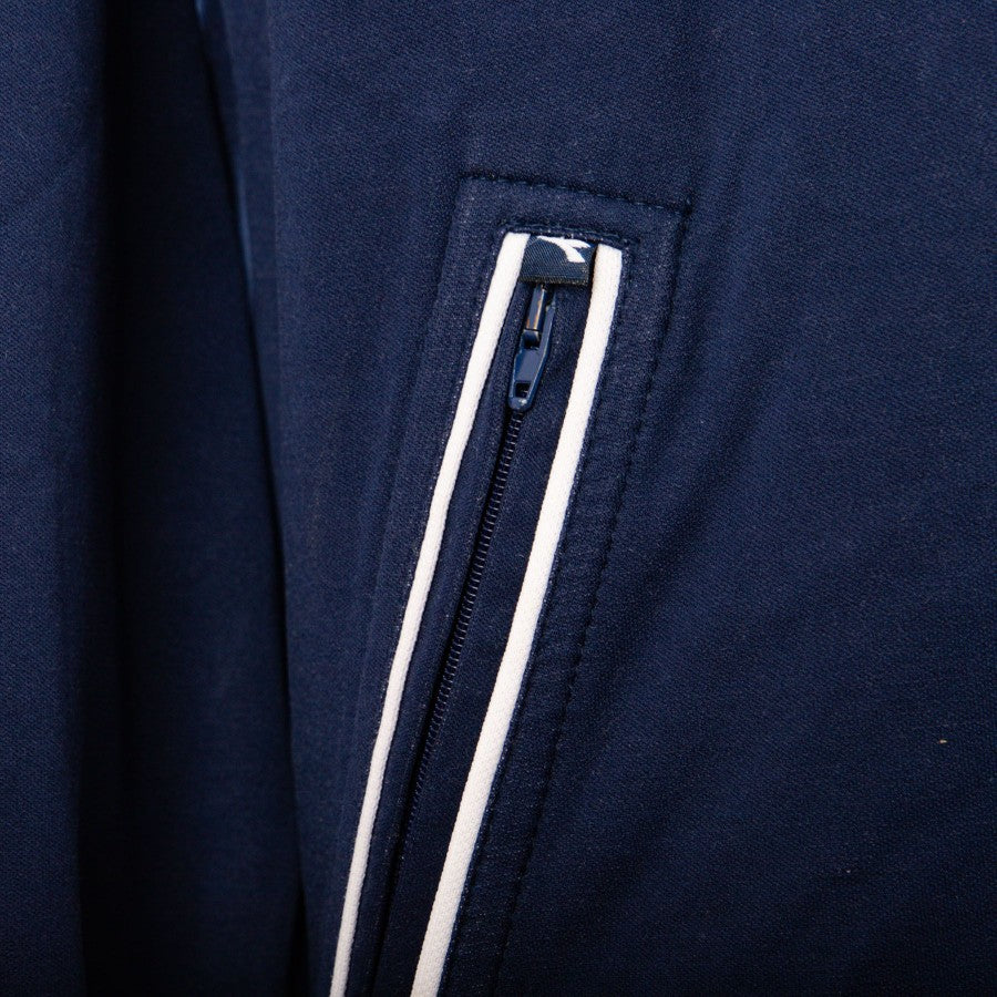 The product is clearly visible from the photos relating to it. The sweatshirt is completely in blue, with the exception of two red stripes that cover the shoulders and a wide red horizontal band present almost towards the end of the article; in reality we find the red color also at the beginning of the sweatshirt, because this closes by means of a zip which, if slightly open, can form a raised red collar; in the center extends the writing BOLOGNA FC 1909 applied in thermoadhesive; at the top right we find the wording embroidered in white of the technical sponsor, DIADORA; the technical sponsor's embroidered logo appears on the right sleeve, while the club logo is applied in velvet on the right sleeve inside a red oval.