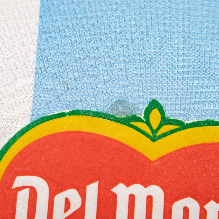 Home model with white and blue vertical bands, with polo collar and knitwear details. The Puma logo and the commercial sponsor Del Monte are applied in flock. Stitched emblem of Lazio. The personalization Mancini 10 is applied in black flock on the back