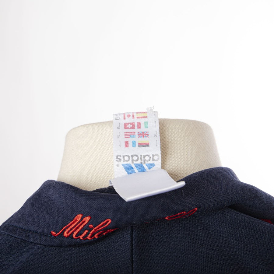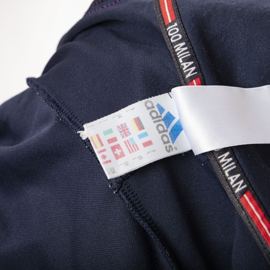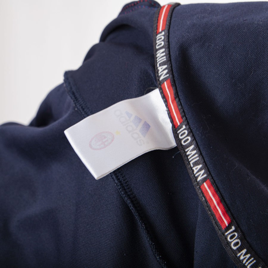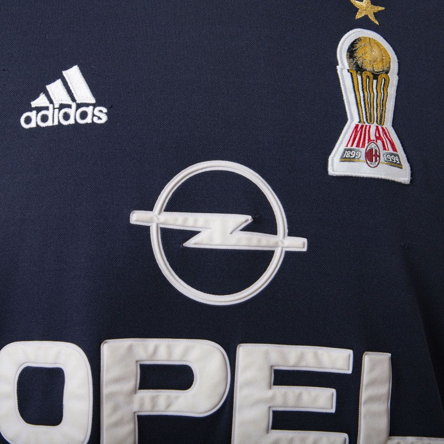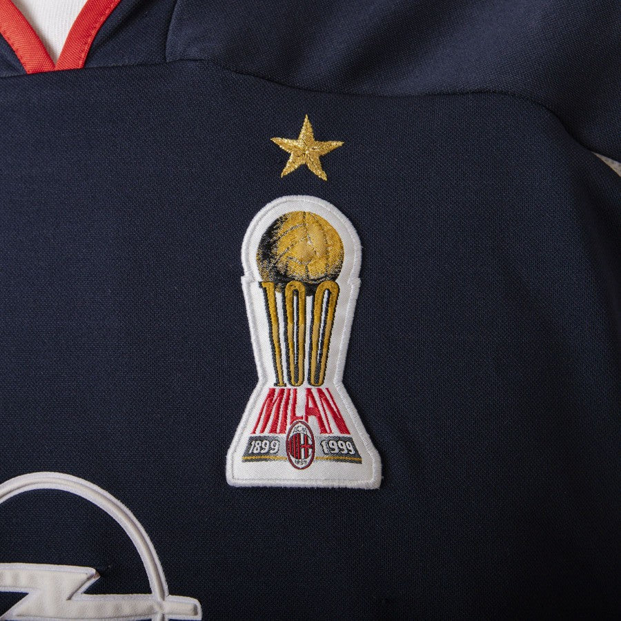 "Special edition" jersey to celebrate Milan's centenary. Short-sleeved model in dark blue with red and black stripes on the sleeves. The shirt celebrates the centenary through the patch sewn on the left side which represents a cup with the club's founding date 1899 inside. Opel sponsor in white flock.