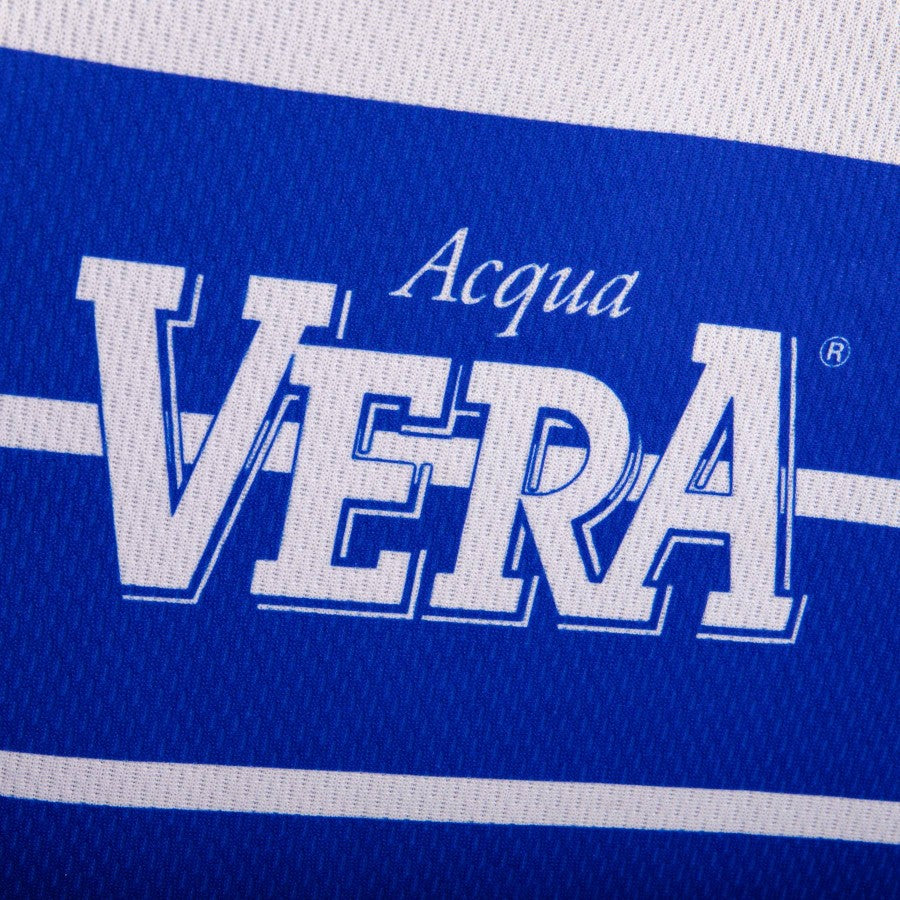 Short-sleeved model, blue with white inserts. Sewn team crest on the heart side, Adidas logo on the right. At the center Commercial Sponsor Acqua Vera. On the sleeve we find the The Match for Peace patch.