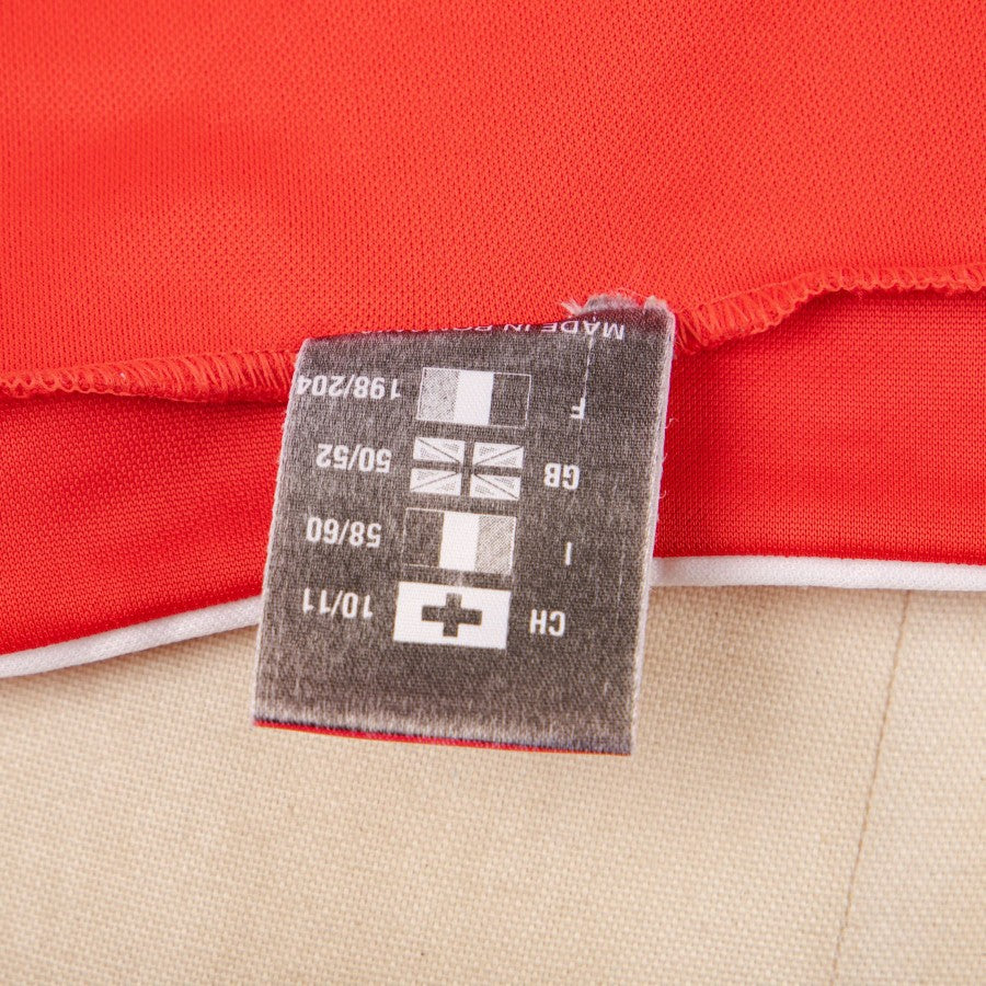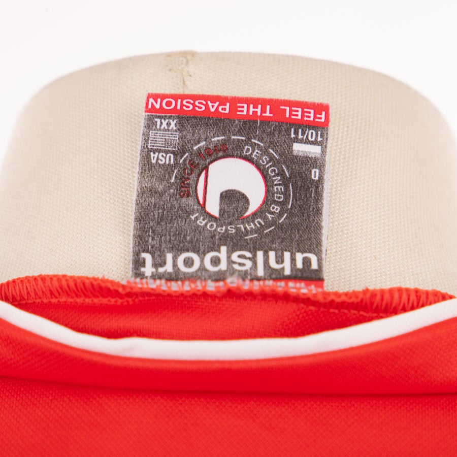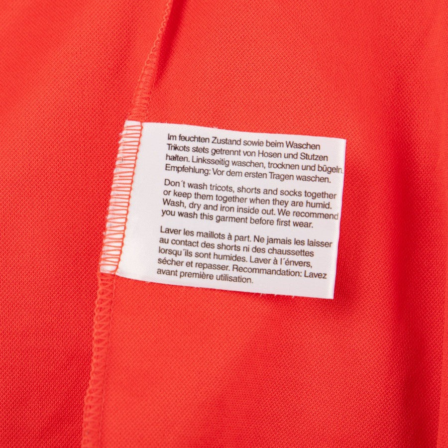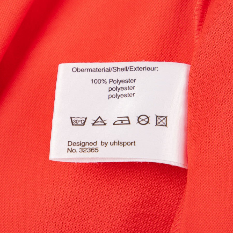 Red crewneck training model with white details. The commercial sponsor is embossed in sublimation on both the front and back of the garment, the team logo is sewn on the heart side, Uhl Sport is applied on the front and in sublimation on the back.