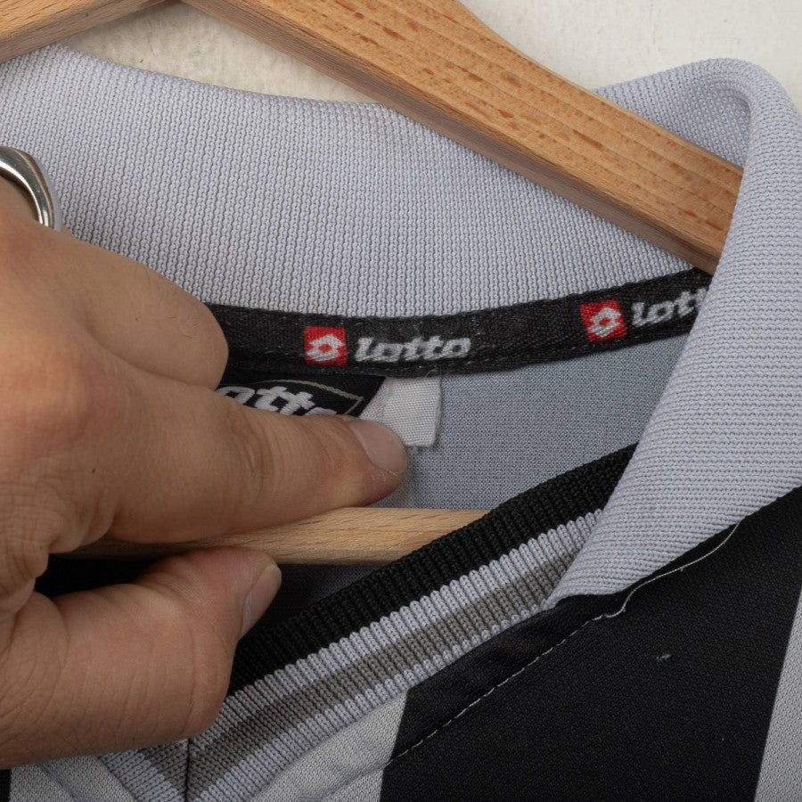 2000/2001 Home Juventus Shirt O'Neill 6 made by technical sponsor Lotto, featuring the club crest stitched on the chest and central commercial sponsor Tele+. Size XL. The back displays the name O'Neill and number 6. This shirt became iconic thanks to the fighting spirit of Uruguayan defender Paolo Montero, who was a key part of Juventus' rock-solid defense in the 2000/2001 season. The wide-striped design and Lotto-branded sleeves make it a standout from that era.