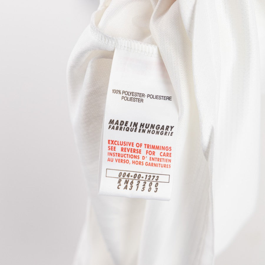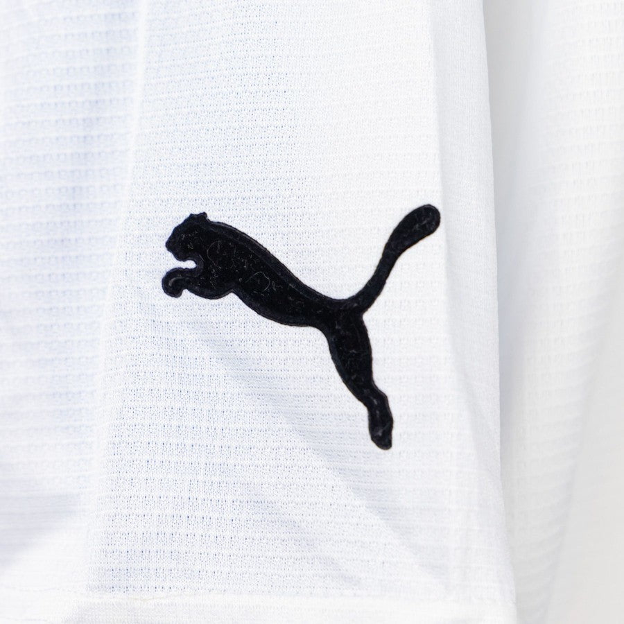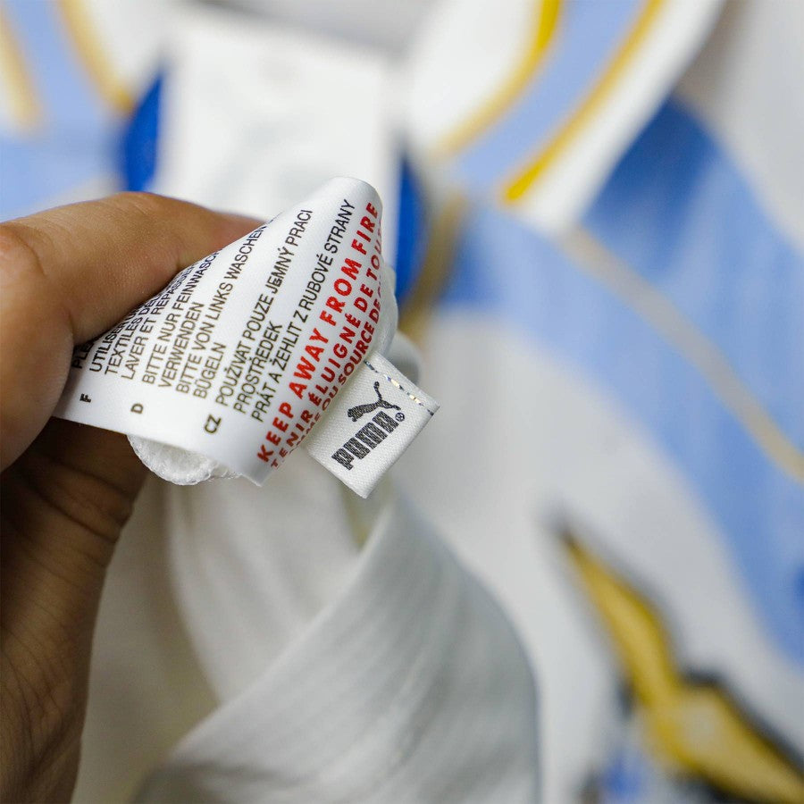 The shirt model is white with golden and light blue inserts. The Lazio logo is embroidered on the front, while on the sleeve we find the Puma logo, also present in the center of the shirt. On the right side there is the Italian Cup with the scudetto. Just behind the latter is another Puma sponsor which can only be seen from inside the kit, making it rare.