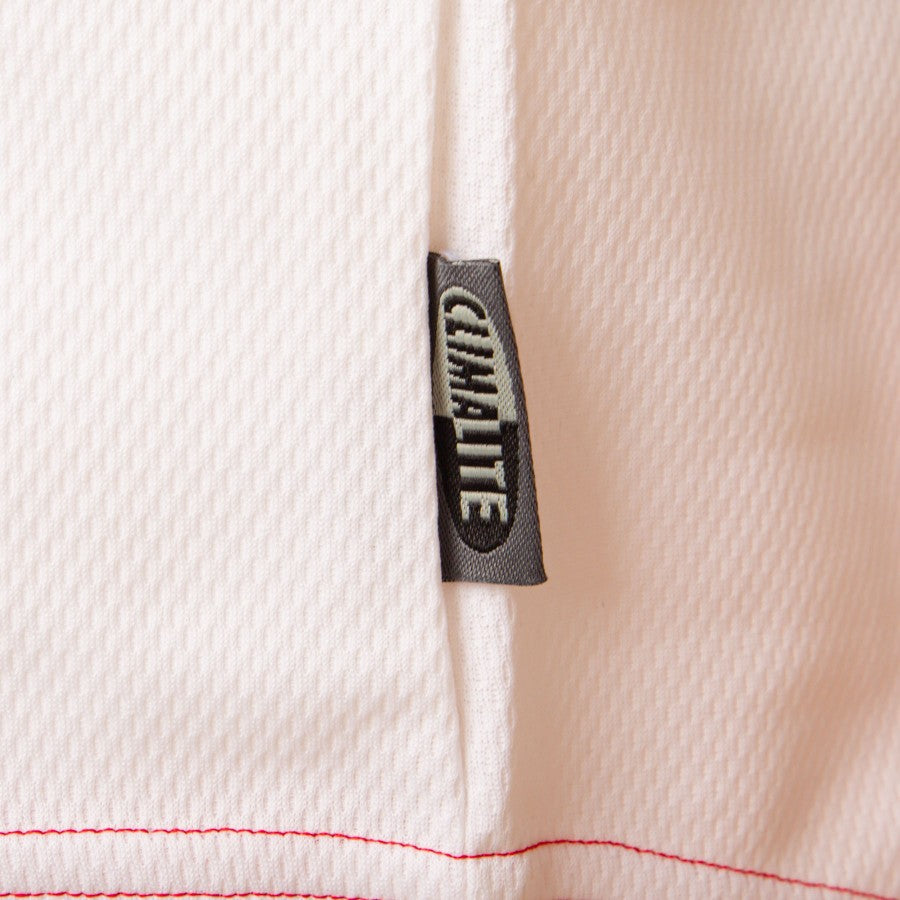 Home version of the Canada jersey produced by Adidas for the 2001/2002 season. Made in a beautiful shade of crimson red, the jersey also features parts in white. Polo collar and knit sleeve edges. Club and technical sponsor Adidas logo in embroidery. Sewn on bottom Adidas authenticity stamp.