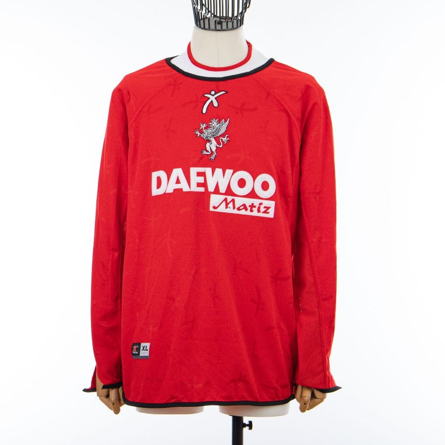 The product is clearly visible from the photos. The shirt has long sleeves with black inserts on the collar and on the edges of the sleeves and the shirt itself; at the top in the center is the white logo of Galex, the Perugia's technical sponsor; below this appears a white griffin, symbol of the club; descending further, the large white wording DAEWOO with a small subtitle, red in a white rectangle, Matiz, the commercial sponsor; on the left sleeve, moreover, we also find the club logo.