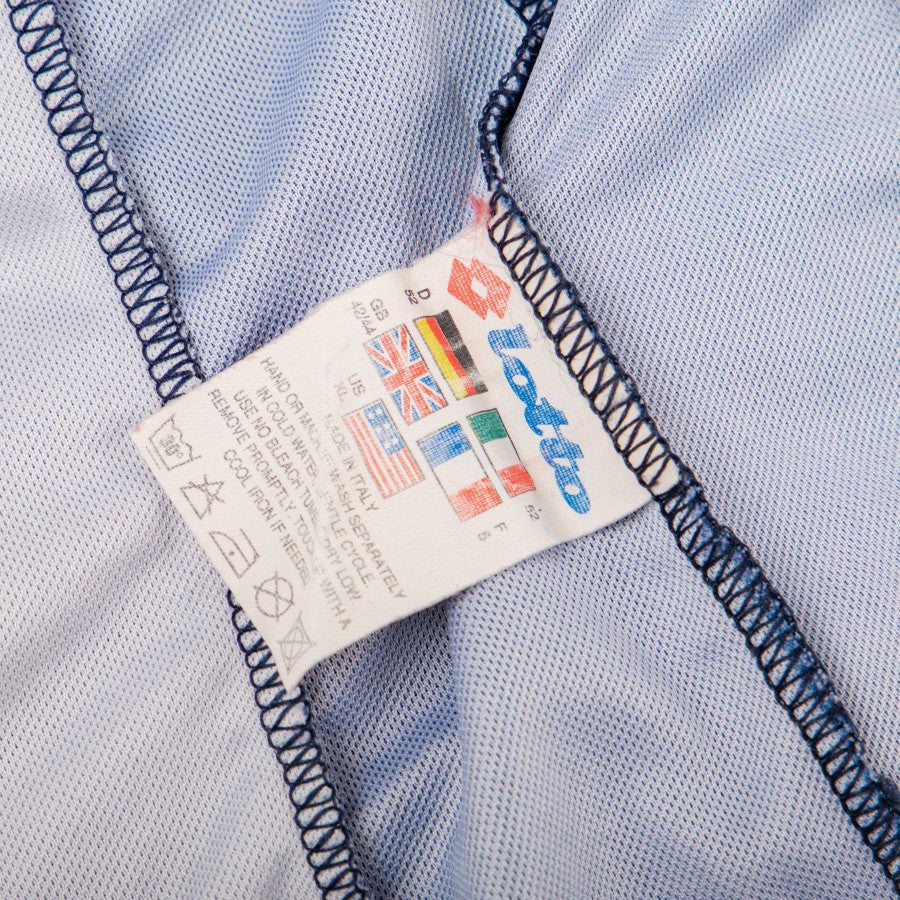 The product is clearly visible from the various photos. The shirt is short-sleeved, almost entirely blue in color, with a white stand-up collar with grey, white and black borders, filled with fabric in black, white and gray colours; the club's embroidered logo is applied to the top left, while the 'lotto' logo, the team's technical sponsor, appears on the right within the texture of the fabric; in the center of the article the logo of the commercial sponsor TELE+ is applied in sublimation; on the sleeves the logo of the technical sponsor is proposed again in sublimation.