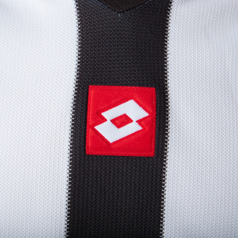 Juventus jersey home model with long sleeves and V-neck collar. Embroidered Juventus patch on heart side and tricolor shield on right side. Both Lotto technical and Fastweb commercial logos are applied in flock. Printed on the back CONTE lettering and the number 8. Football League patch sewn on the right sleeve. Also present is the Lotto authenticity label.