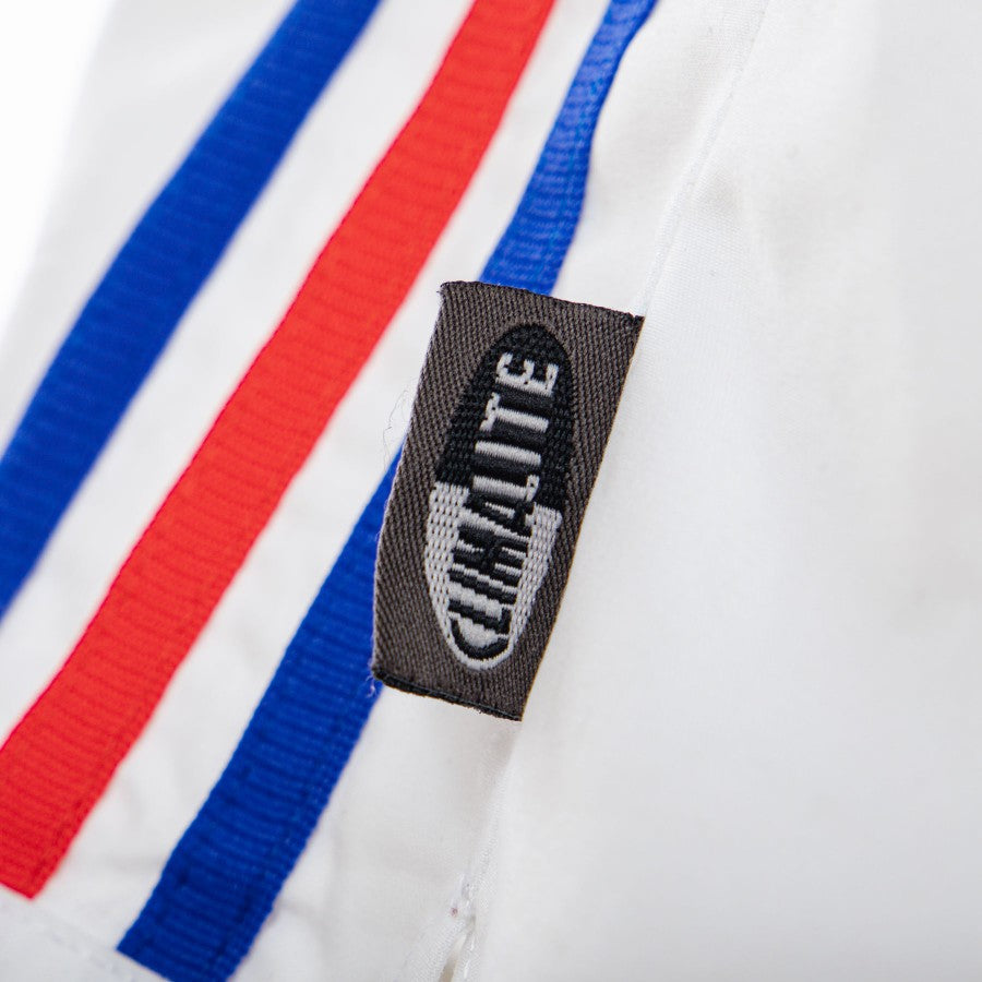 The model is white, with the Adidas logo embroidered in blue on the left side and the team crest embroidered in gold with a star above it on the opposite side. Along the sides are the three lines with the colors of France.