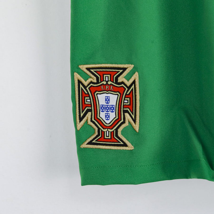 These green Portugal shorts by Nike, from the 2010/2011 season, feature the Portuguese federation logo embroidered on the right and the Nike logo on the left. A white stripe runs along the sides. During this time, Portugal was gearing up for Euro 2012 qualifiers, with a talented generation aiming to make their mark.