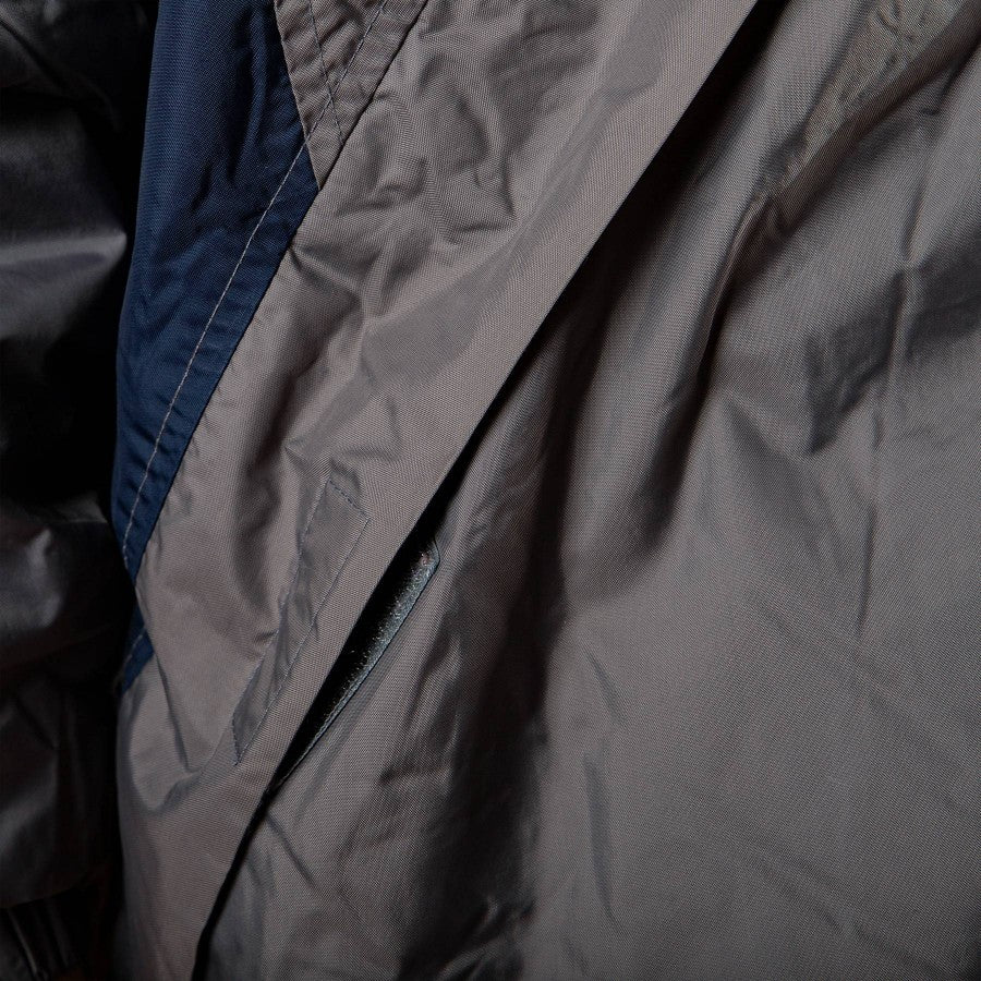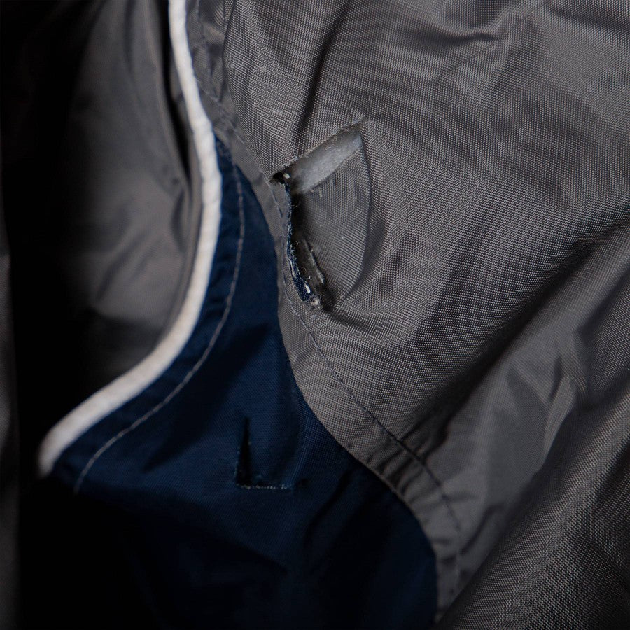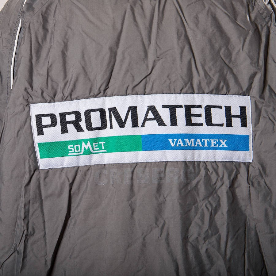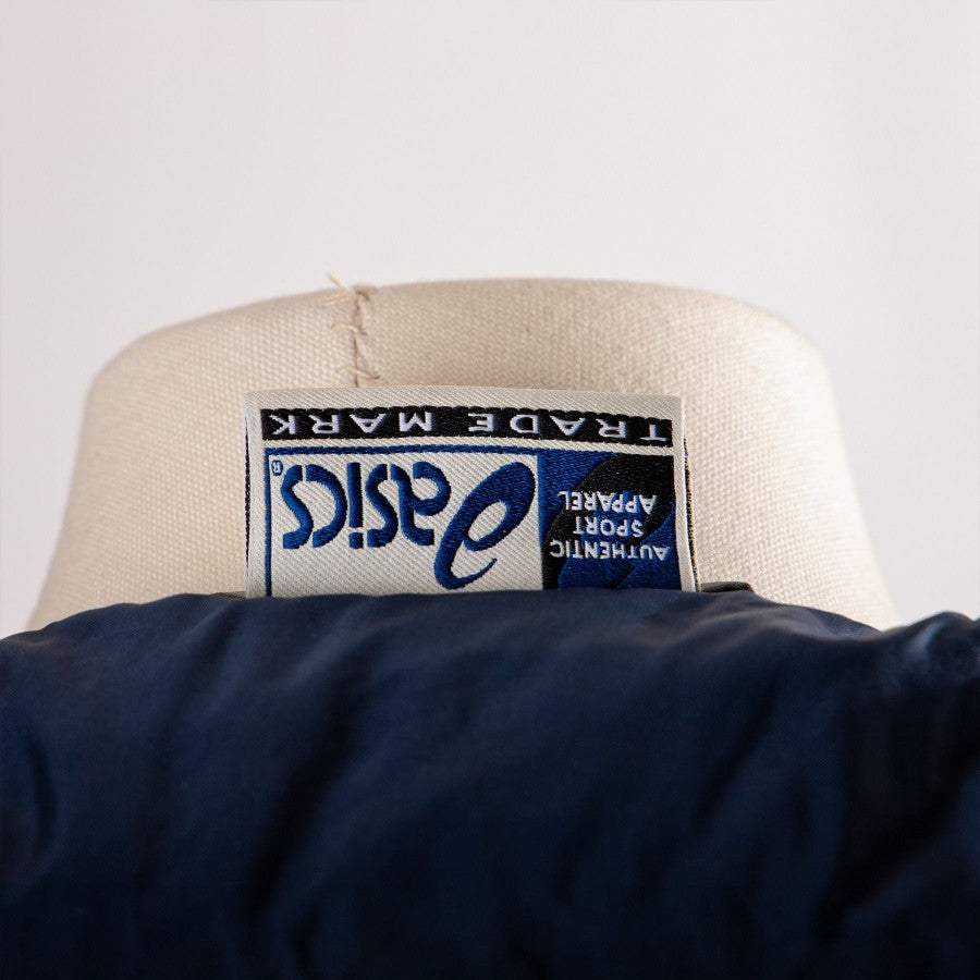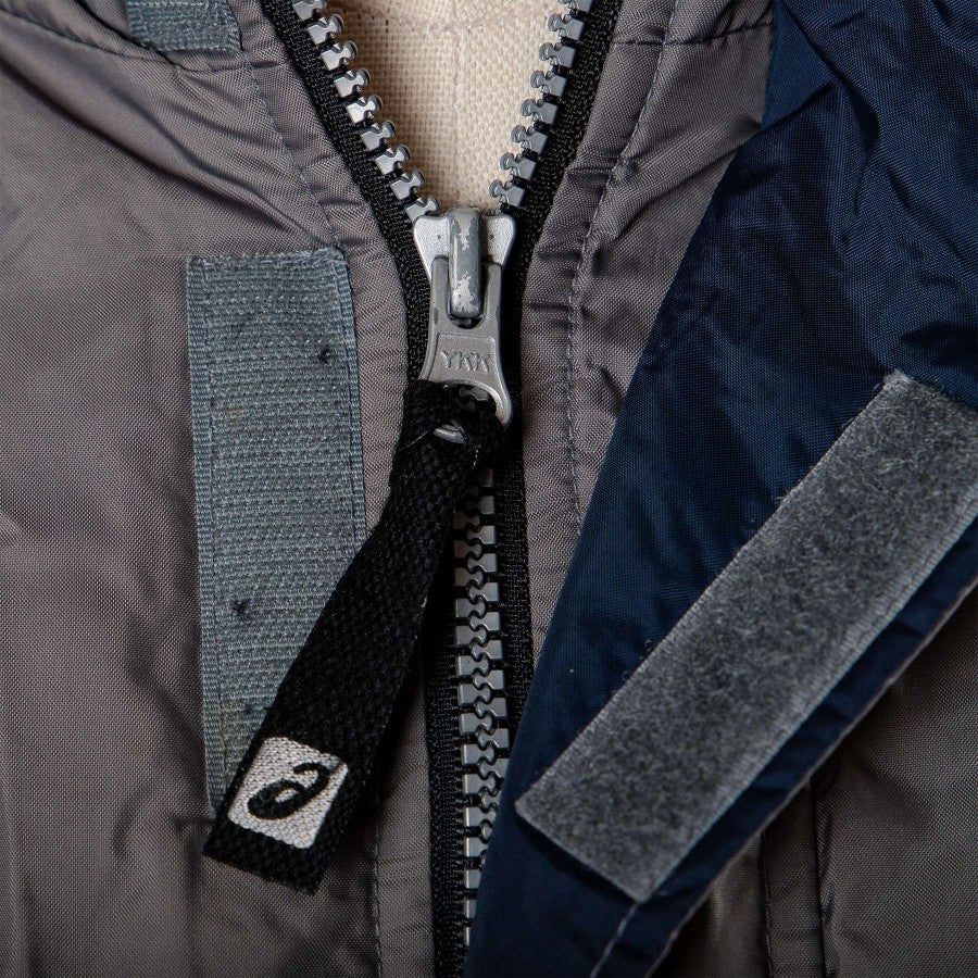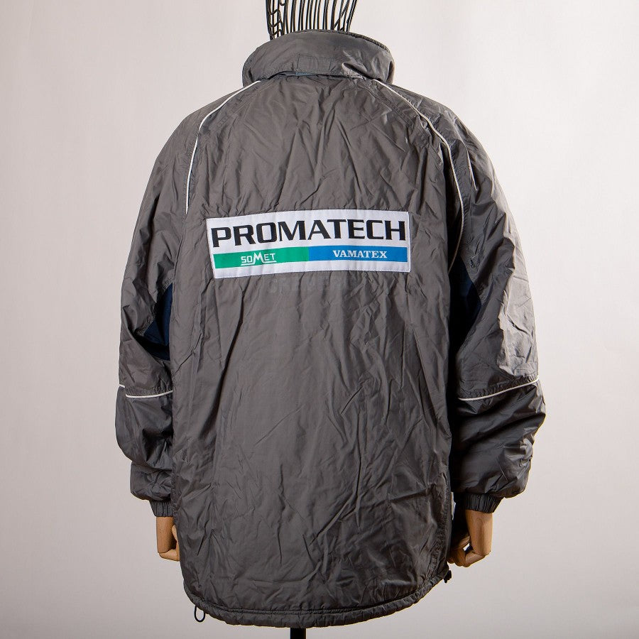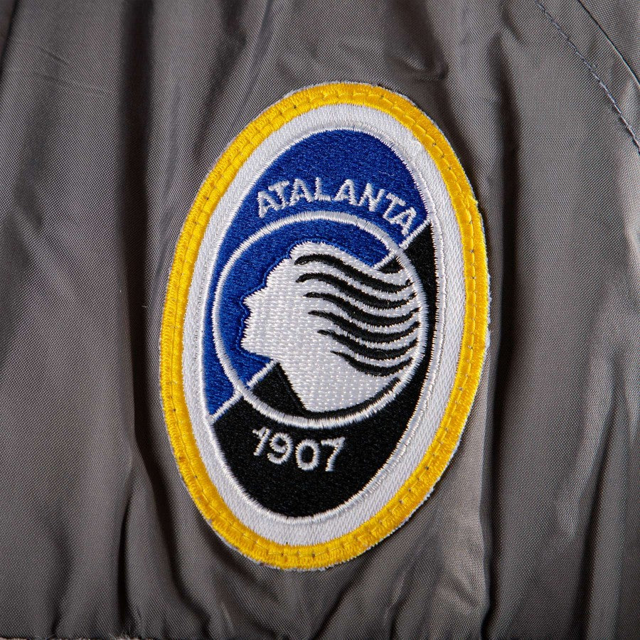 Atalanta jacket of the 2003/2004 football season. Grey padded model with blue inserts, full zip with hook-and-loop fasteners. The Atalanta patch is sewn on the heart side, while the commercial sponsors Promateck and Creberg are embroidered. The technical sponsor Asics is embroidered on the right. There is a hood on the inside of the collar and an internal pocket.