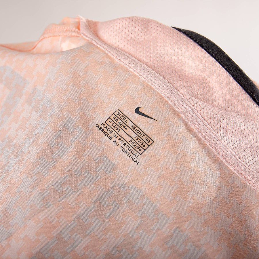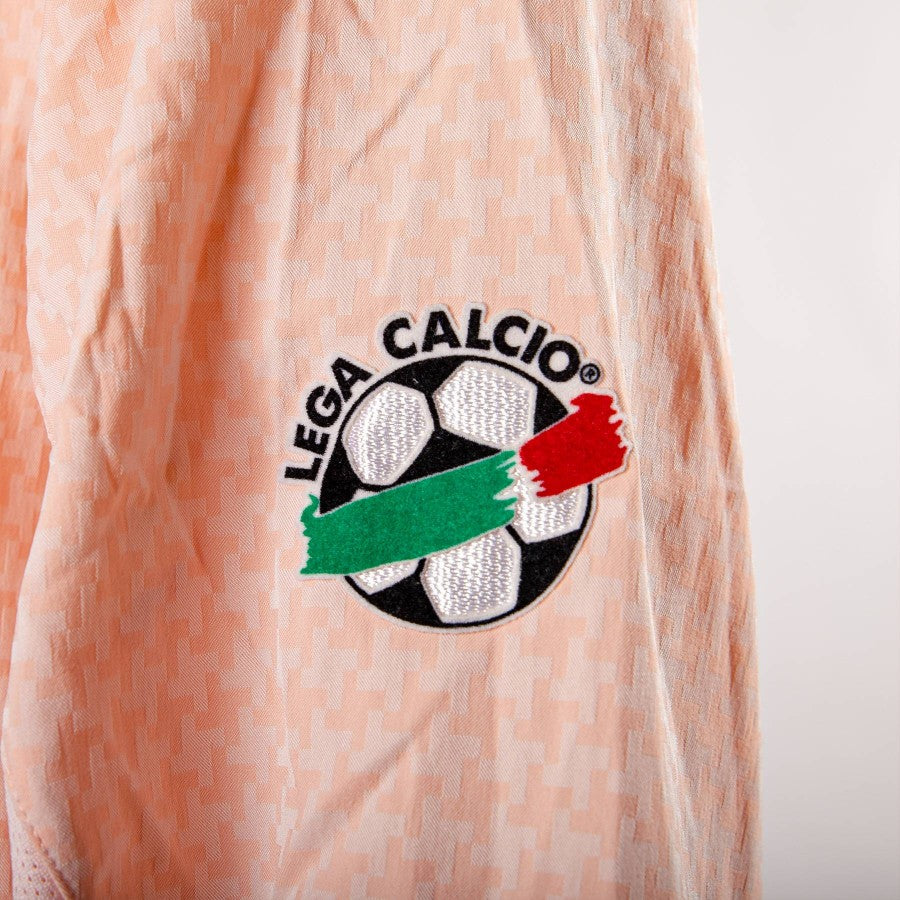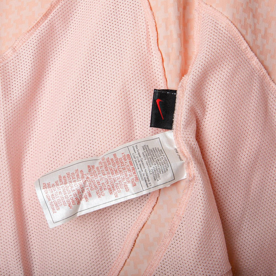 Juve away jersey, football season 2003/2004. Pink model with long sleeves and V-neck. On the front of the jersey, the Juve patch is embroidered on the heart side with the two stars, while the tricolor shield is sewn in the center and the logo of the technical sponsor Nike is embroidered on the right. In the middle, applied in light plastic, the commercial sponsor Fastweb. On the back are printed lettering NEDVED and the number 11. Finally, the Lega Calcio patch is applied to the right sleeve.