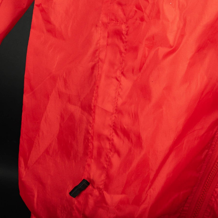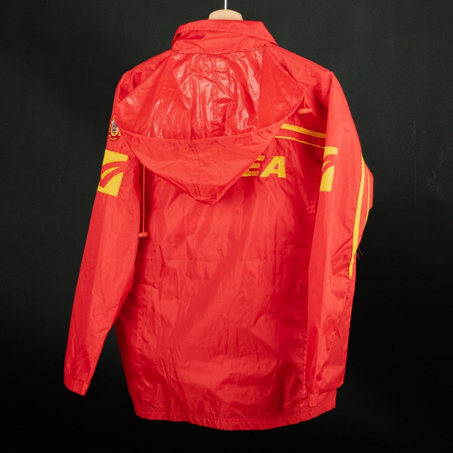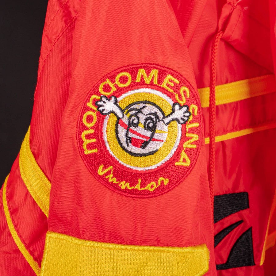 Model with red hood with yellow inserts, full zip model with personalized zip and side pockets with zip. On the heart side we find the Messina logo and the commercial sponsor Caffè Miscela D'oro, on the right the embroidered Legea logo. On the sleeve we find the Mondomessina Patch.