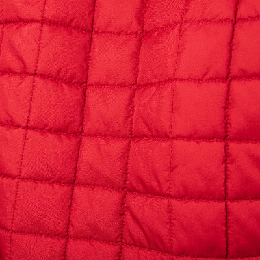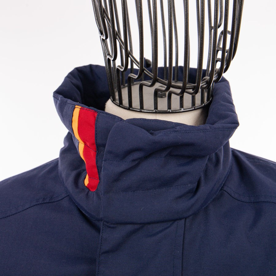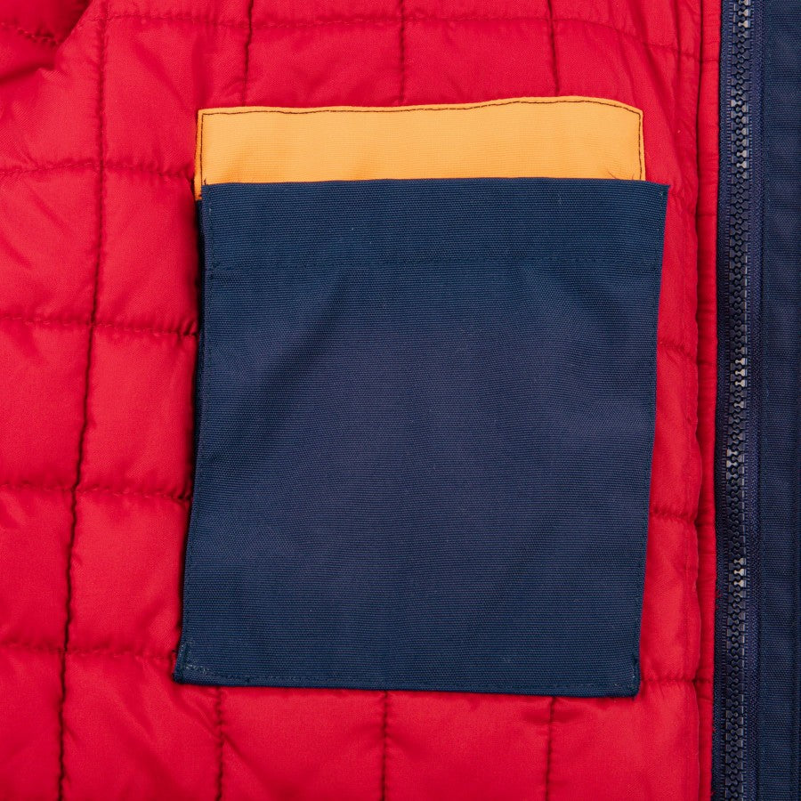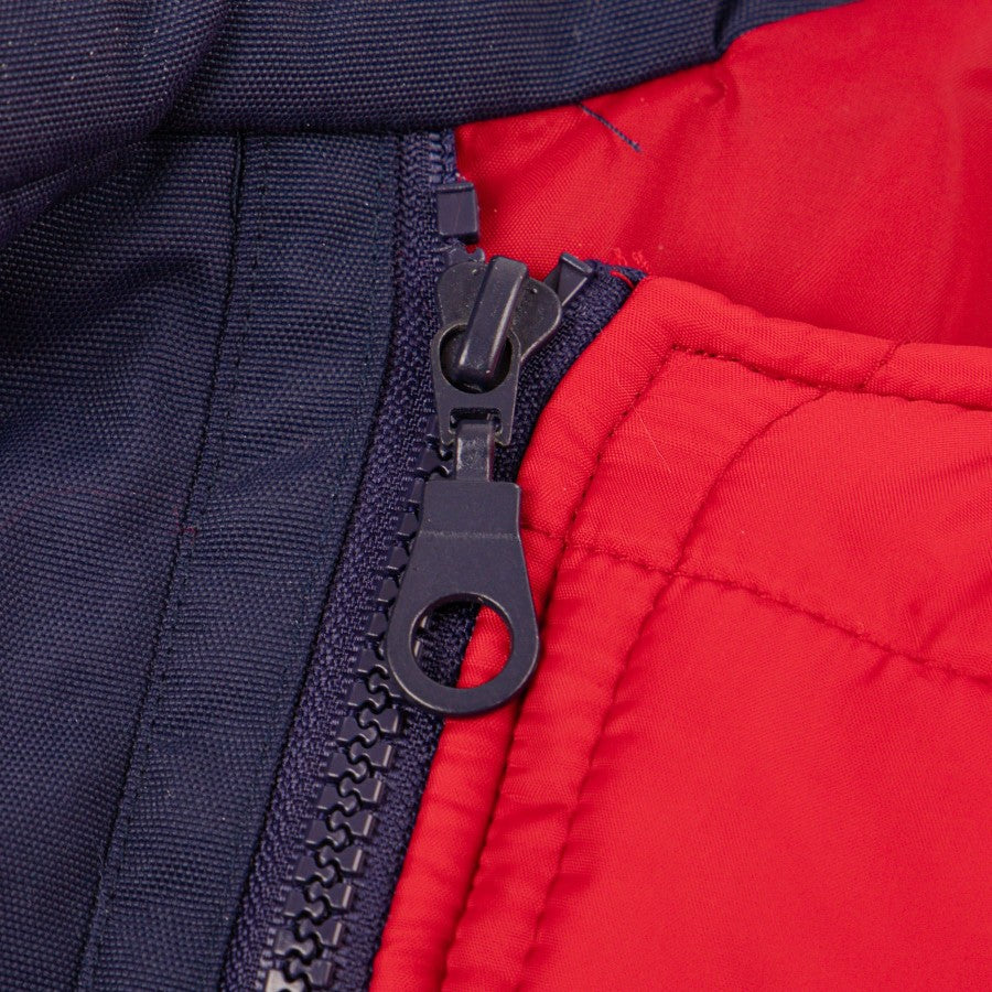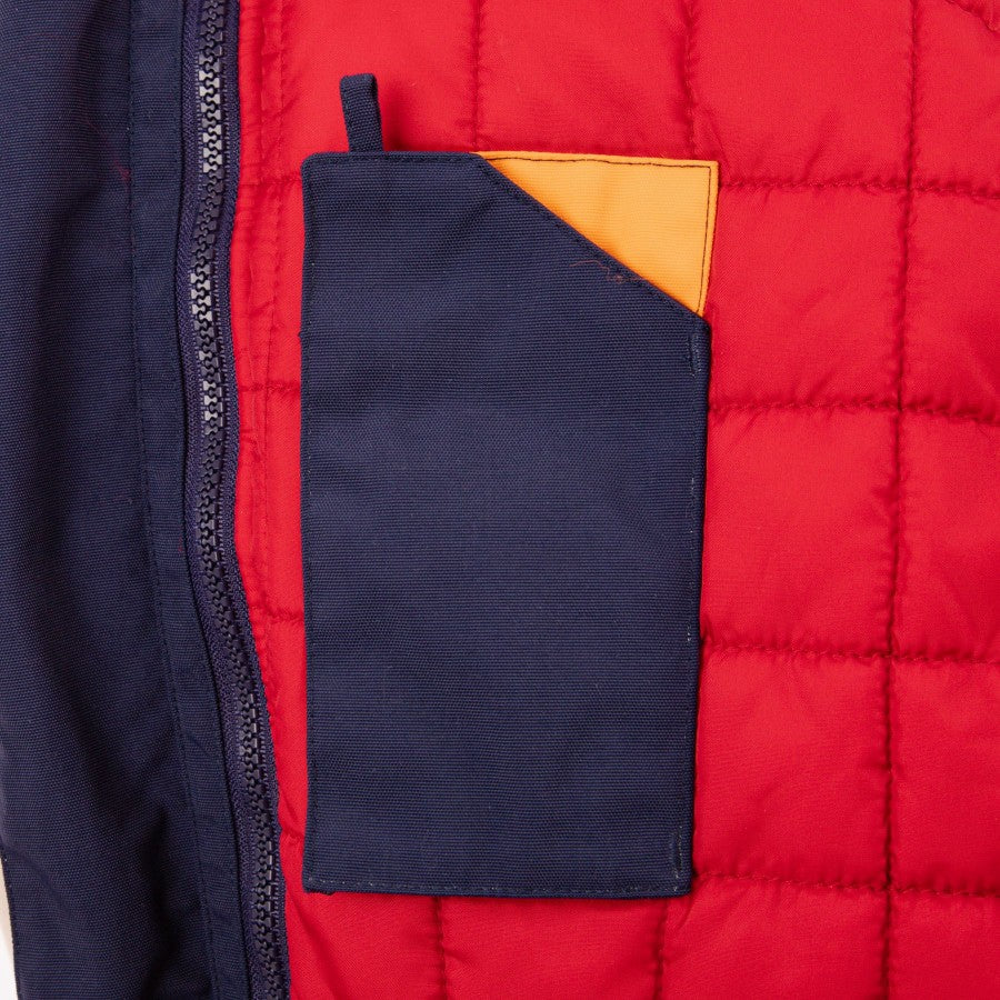 The jacket is blue, with red and yellow inserts on the neck and arms. The interior is quilted in red and there is also a pocket on the left side. Side pockets and central closure in blue zip.