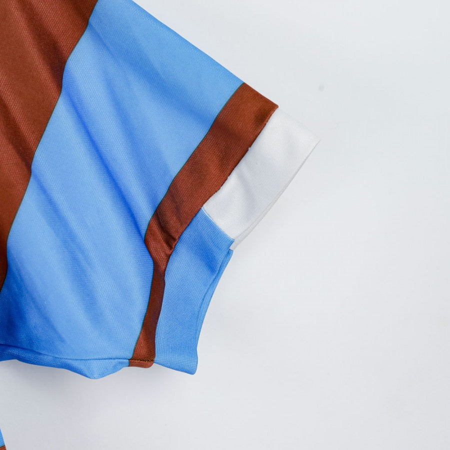 The jersey features horizontal light blue and maroon stripes with a lace-up collar, the club crest on the left chest, and another crest on the back to celebrate the team's centenary.