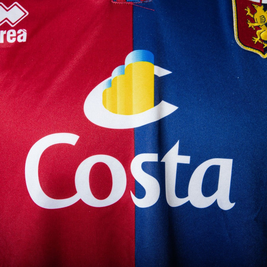 Genoa patch sewn on the heart side and Errea technical sponsor applied in sublimation on the right side. The commercial sponsor is Costa Crociere applied in the centre always in sublimation.