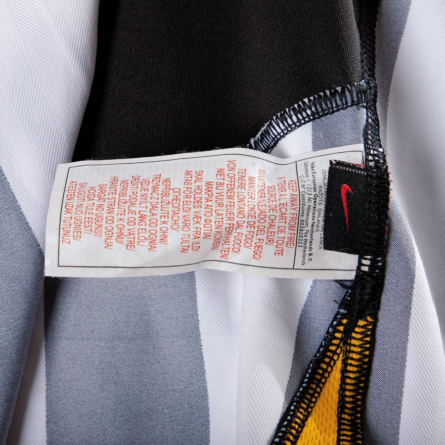 The product can be admired well from the various photos. The shirt has short sleeves and is characterized by the white background color and the black of the vertical stripes that cross it; the shield is applied to the top left, the club logo in the center and the yellow logo of Nike, technical sponsor, to the right; below these, here is the Juventus commercial sponsor, Tamoil.