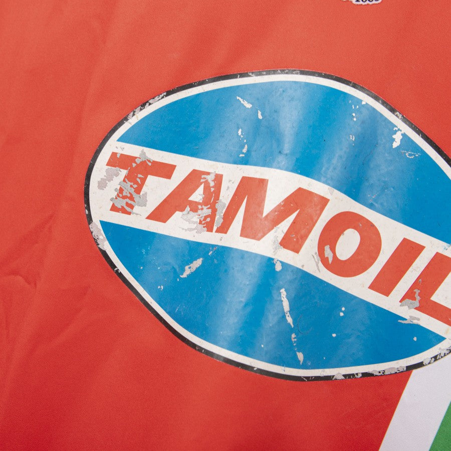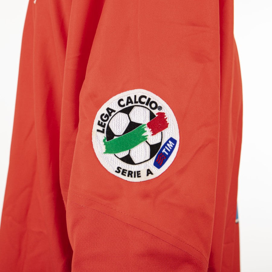 Short-sleeved red model, what characterizes the uniform is undoubtedly the tricolor vertical band on the right side, which houses the embroidered shield surmounted by the two stars. The Juventus club crest is sewn in the center of the chest, which in that year celebrated its centenary of the first championship. On the right the technical sponsor Nike is applied, in the center the commercial sponsor Tamoil is applied. Emerson 8 personalization on the back