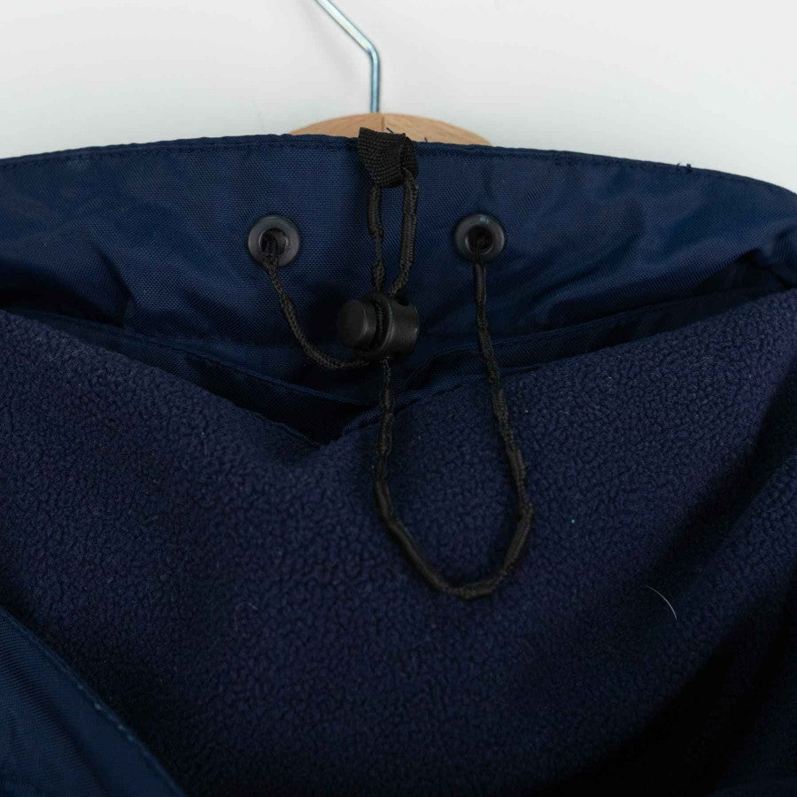 The jacket is blue, with red inserts on the shoulders. Side pockets and central blue zip closure.