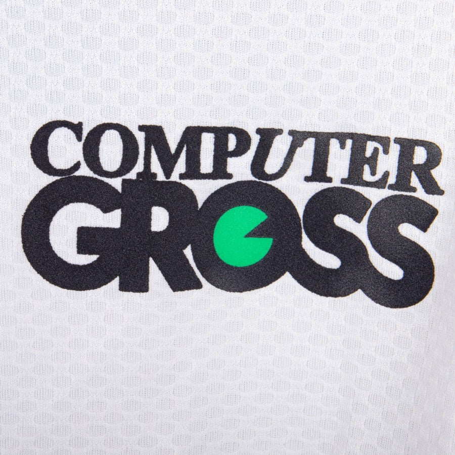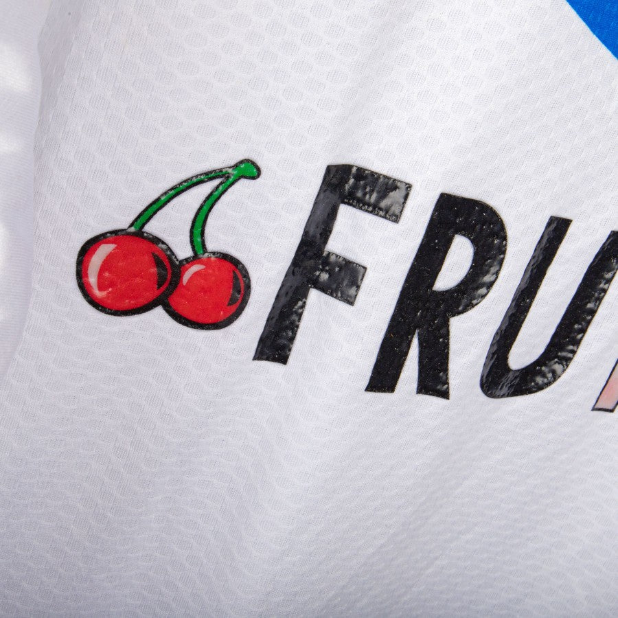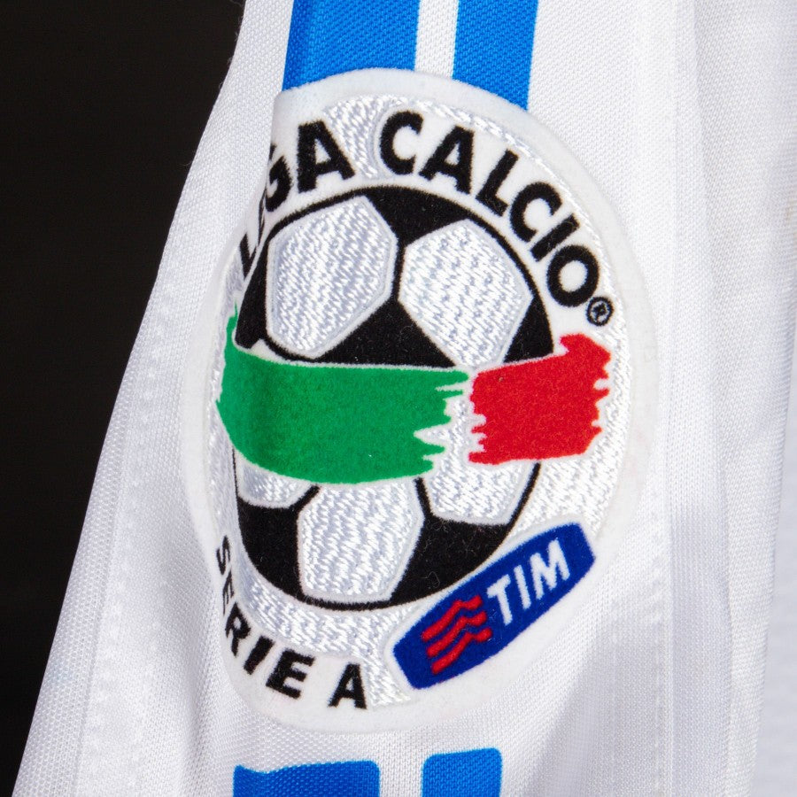 White model with blue inserts and V-neck. Empoli emblem in the center and Asics on the right. On the left Commercial Sponsor Computer Gross and Fruit centered below. On the sleeve there is the Lega Calcio Serie A Tim patch.