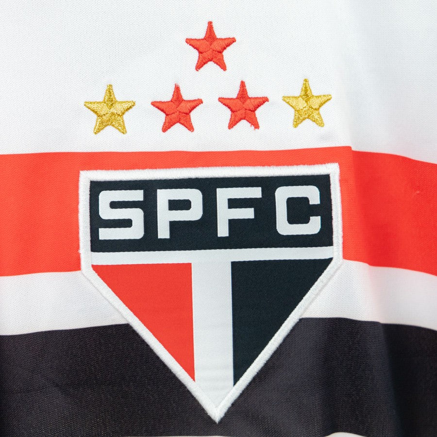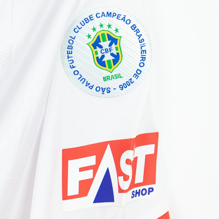 White model with red and black inserts. In the center we find the Commercial Sponsor Reebok, the team crest and the initials SPFC and the technical sponsor Reebok. On the sides of the sleeves there is the Fast Shop logo and the 2006 Sao Paulo Patch.