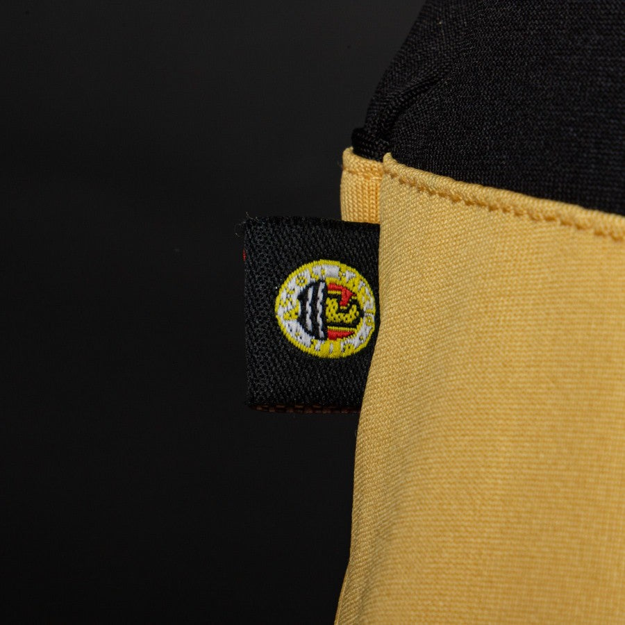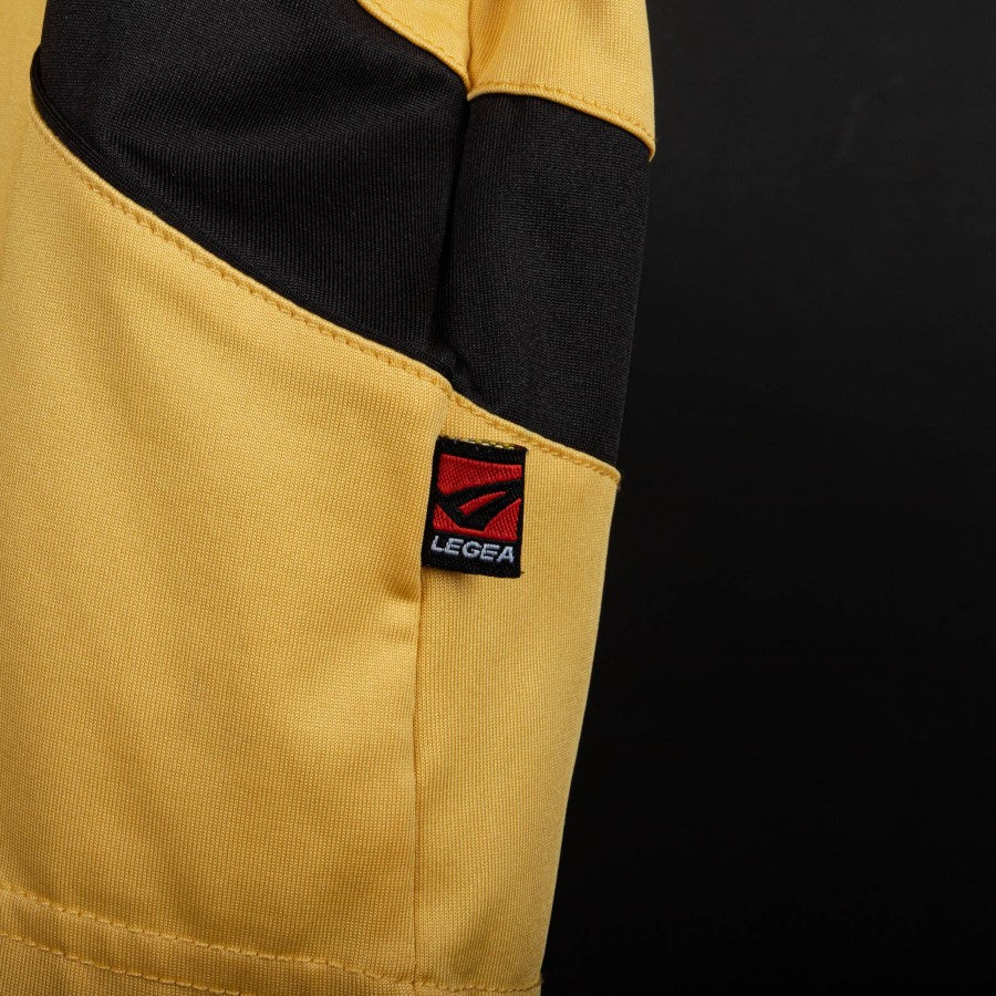 Gold colored model with black inserts. On the front we find the Legea Sponsor and the Team crest with the C.I.A.M. logo. on the right. Commercial Sponsor Carisap is present a little further down. Lega Calcio Serie B patch on the sleeve.