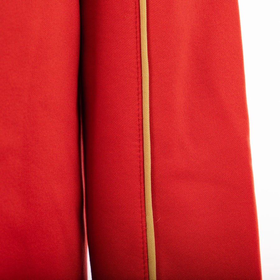 The training product features a half zip opening and long sleeves. The predominant colors are red and with some gold-colored inserts. On the right sleeve there is the writing 'Asics'. The club crest is sewn on the heart side, while the Asics sponsor is screen-printed on both the front and back.