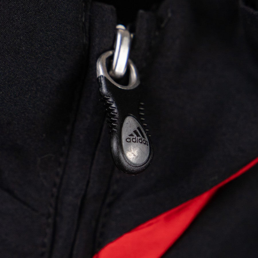 Full zip model in black with red inserts and personalized zip. Side pockets. On the heart side we find the sewn AC Milan crest and printed Bwin commercial sponsor. On the right the Adidas logo embroidered in red.