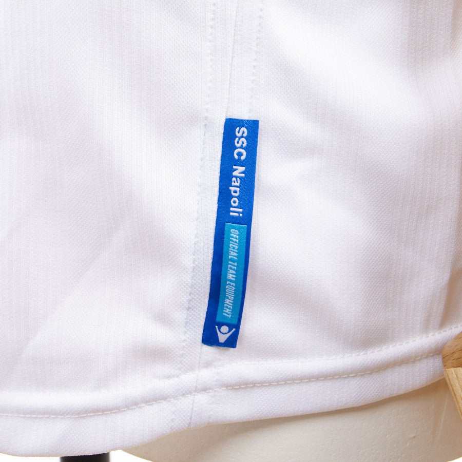 Short-sleeved model, white, with light blue breathable crew-neck, and sleeve edges in the same color. On the front, on the heart side, the Napoli crest is embroidered. The Macron lettering is embroidered just below the crew neck, while the Macron logo is applied in light plastic on both sleeves. On the right sleeve, the Serie A logo is applied in flock, and the commercial sponsor LETE is applied in the center on the chest. On the back, the Lucarelli 99 personalization is applied in light plastic
