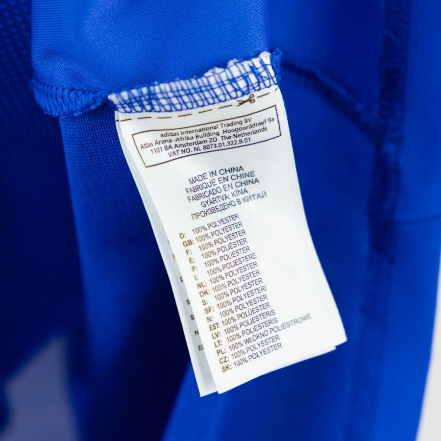 Short-sleeved model in blue with white inserts. Embroidered team crest on the heart side, white Adidas technical sponsor on the opposite side. Below, thermally applied Samsung commercial sponsor. On both sleeves we find the Premier League patch.