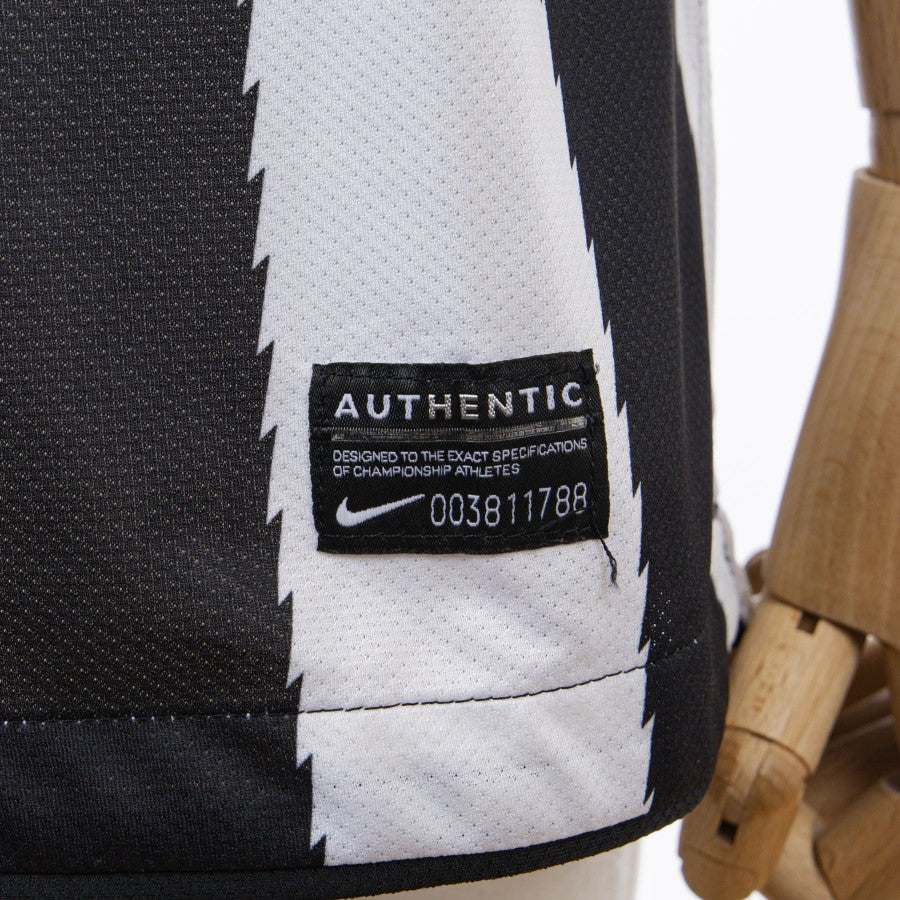 The shirt has long sleeves with white cuffs. The main color is white, with black vertical stripes characterized by a fringed effect. The club logo is sewn on the left side, while the yellow logo of Nike, the team's technical sponsor, is embroidered on the right side. Below them is the logo of BALOCCO, the commercial sponsor. On the back, in rubbery relief, there is an imposing yellow number 14.