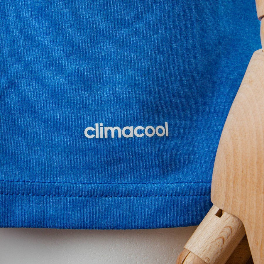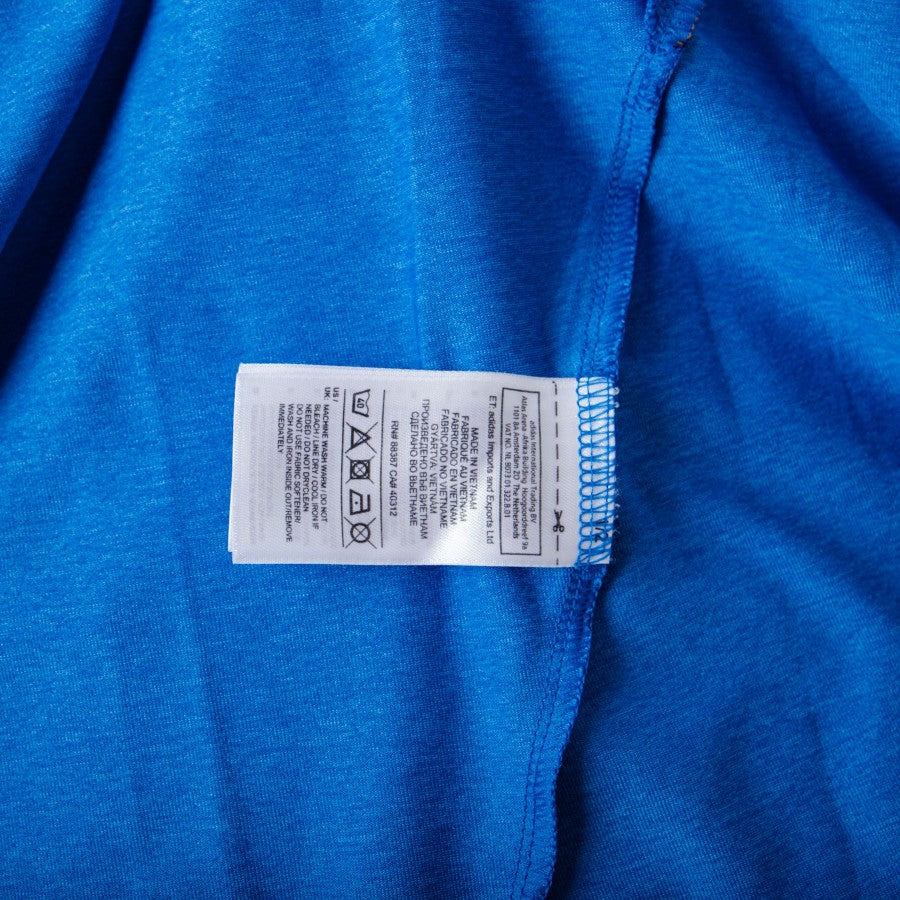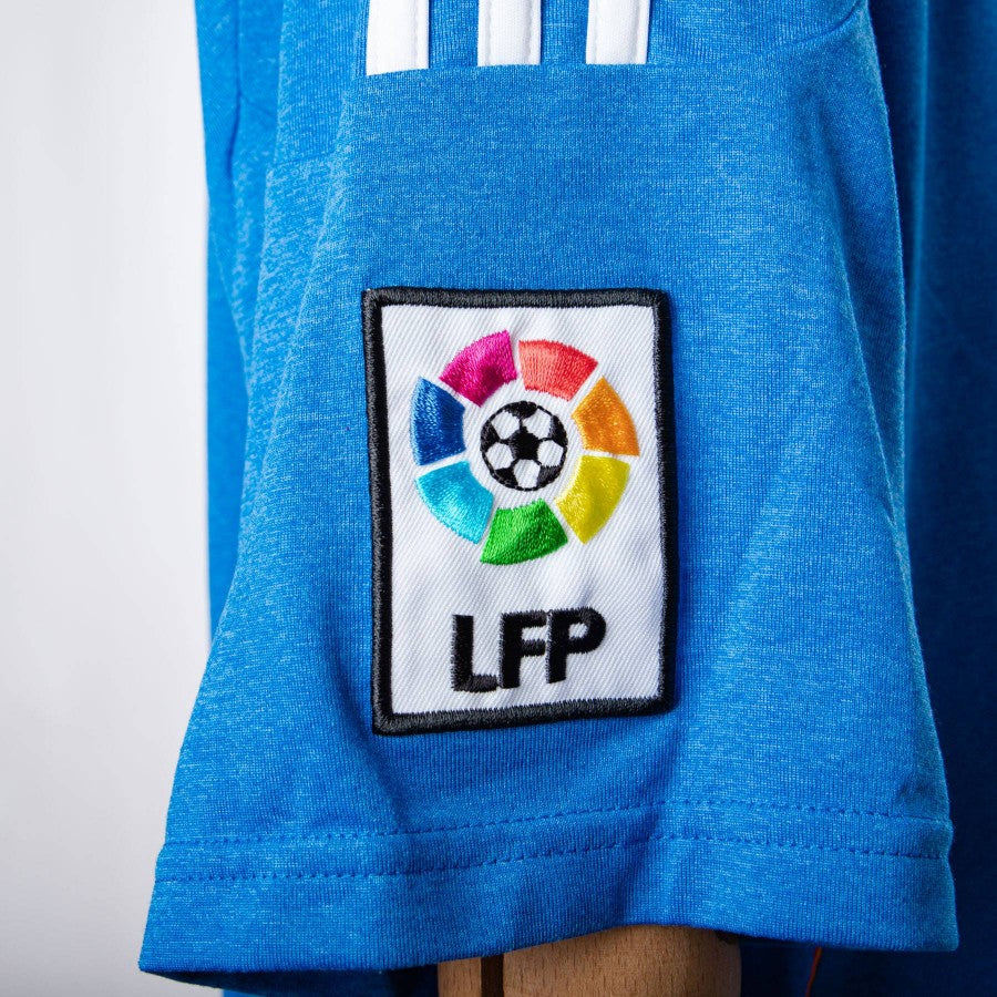 Real Madrid away model produced by Adidas for the 2013/2014 season. Blue version with white details, short sleeves and crew neck. Breathable fabric inserts along the sides. The RONALDO 7 personalization is applied on the back in light plastic. Adidas logo and Real Madrid patch embroidered on the front. The Spanish La Liga patch is applied in embroidery on the right sleeve. Main sponsor Fly Emirates.