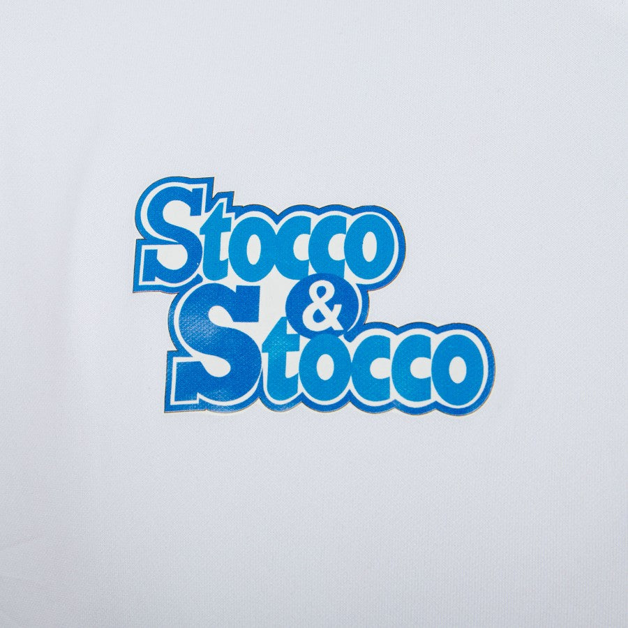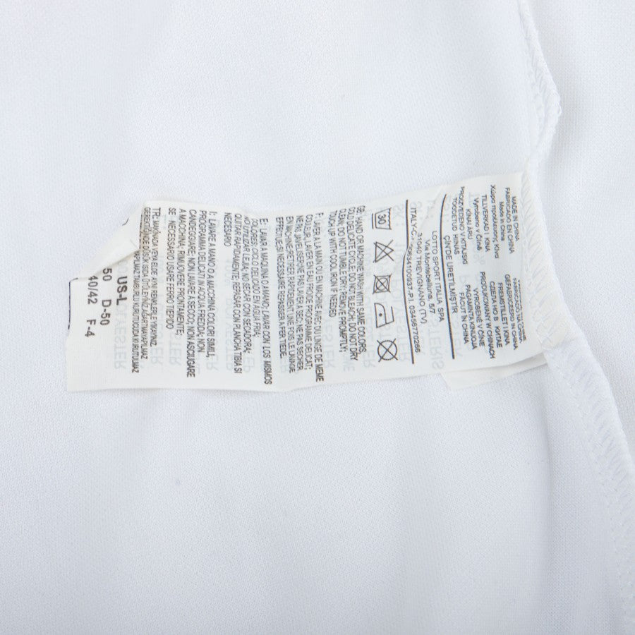The product can be clearly seen from the photos relating to it. The shirt has long sleeves and its prevailing color is white: at the top left we find the club logo, while on the opposite side the wording, in white and blue, Stocco & Stocco is applied; below these appears the CIAO logo with the subtitle 'innovating your future', in red; on the right shoulder there is a small wording in black 'lotto' complete with logo, while on the other side there are four oblique amaranth stripes as a kind of scratches; the same logo, always in black but in increased size, is inside the weave on the left sleeve where there is also a small Serie B patch with the writing RISPETTO, in white and blue; a large Serie B EUROBET patch is applied to the other sleeve.