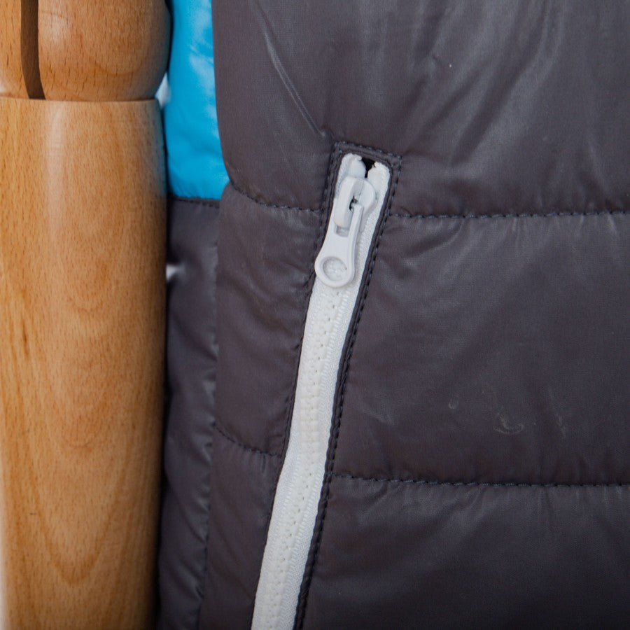 The product can be well admired from the various photos. The vest is sleeveless, has a long zip in the center, two zipped pockets at the level of the abdomen and its predominant color is grey; at chest height there is a large vertical blue band that crosses the front and back of the item; the club logo is applied to the top left, with the white logo of Macron, the blue technical sponsor, underneath, while on the opposite side we find the logos of the commercial sponsors, Lete and MSC.