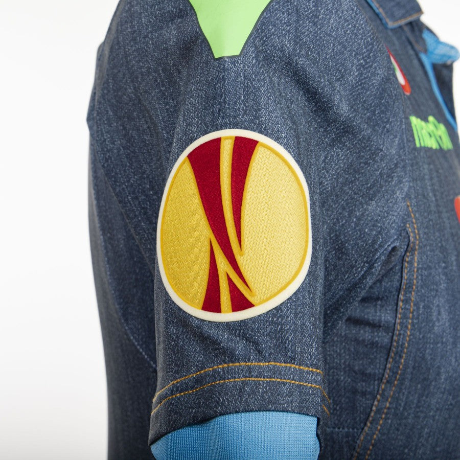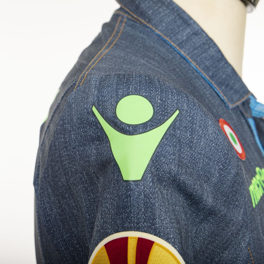 Model away short sleeve used in Europa League matches. This 'denim' model made by Macron differs from other shirts in its whimsical style, The basic template is identical to the other Napoli jerseys, with the polo collar, Prince of Wales inserts and the end of the sleeves in contrasting, light blue color. The highlight is the graphic reproduction of denim fabric, complete with visible stitching. On the front, heart side is embroidered the coat of arms of Napoli with green border, at the opposite side we find embroidered in green the lettering of the technical sponsor Macron, immediately on sewn the cockade of the Italian Cup won the previous season. On the right sleeve sewn the patch of the Europa League, on both shoulders applied in green the Macron logo. In the center of the chest applied the commercial sponsor Lete. On the back, where the 'Ssc Napoli' embroidery appears at the top, the Higuain 9 personalization in green is applied.