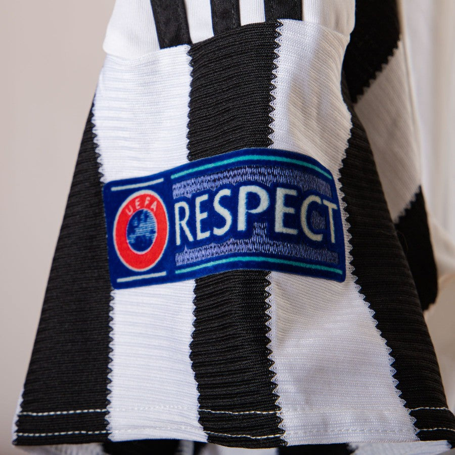 The Juventus home jersey is made in the typical corporate colors of black and white.
