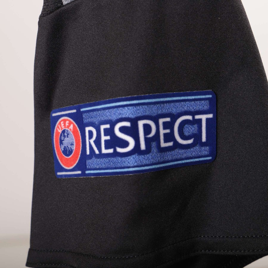 Juventus goalkeeper jersey of the football season 2015/2016. Black model with grey inserts, half sleeve and crew neck. On the front are applied the team patch, the tricolor cockade and the shield, while we find embroidered the logo of the technical sponsor Adidas and the 3 stars. Applied in light plastic, there is also the commercial sponsor Jeep. On the back are stapled white lettering BUFFON and the number 1. Applied on the sleeves the patch Respect and the patch Champions.