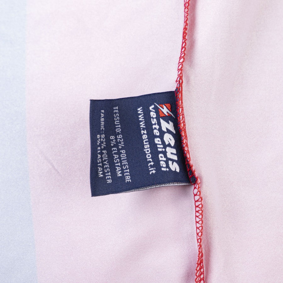 The Calabrian team's jacket is blue on the upper part of the torso and in red and blue stripes on the lower part, while the short sleeves are red, with edges in red and blue tones. The emblem of the sports club is sewn on the heart side, the lettering of the technical sponsor Zeus is visible on the right side and that of the commercial sponsor MetalCarpentieri in the centre. On one arm, on the other hand, the Serie B football league patch and the Zeus logo are applied. Lastly, on the back there is the personalization with the number 11 Budimir and the champion's autograph.