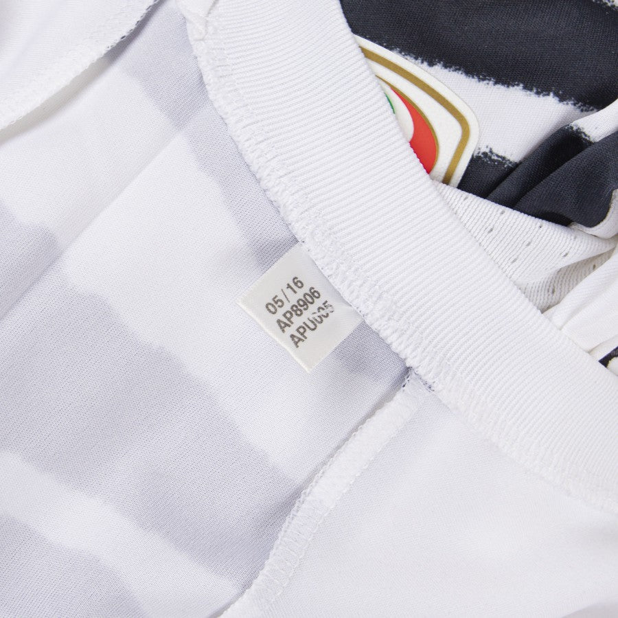 Short-sleeved model in white. The shirt has a black and white zebra design on the shoulders that strongly characterizes the shirt. The rest is white with adidas stripes on the sides and a 'V' collar. Below in the center the tricolor shield is sewn, the Juventus club emblem surmounted by the three embroidered stars is embroidered on the heart side. On the right under the embroidered cockade of the Italian Cup there is the logo of the commercial sponsor Adidas, also embroidered. The Jeep commercial sponsor is applied to the center of the jersey. The Serie A patch is applied to the right sleeve. Pjanic 5 is personalized on the back