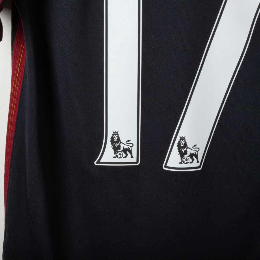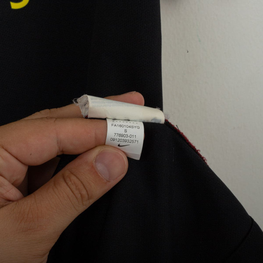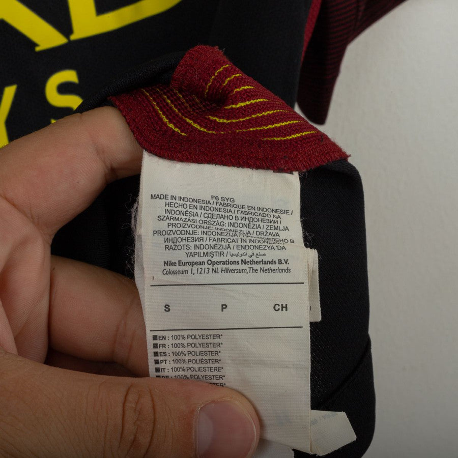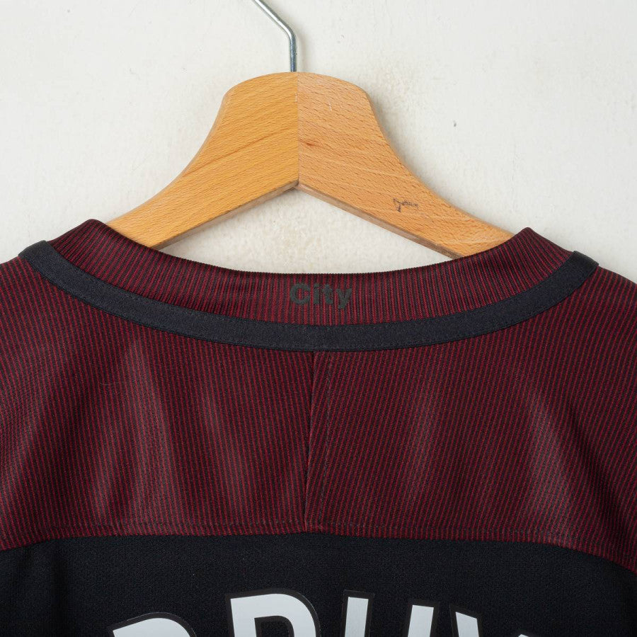 Manchester City away shirt from the 2016/2017 season, made by Nike. Black with burgundy sleeves and yellow details. Etihad Airways sponsor and Nike logo applied. Manchester City crest applied on the chest. "De Bruyne" and number 17 on the back in official Premier League style. Slim fit, size S. Made in Indonesia.